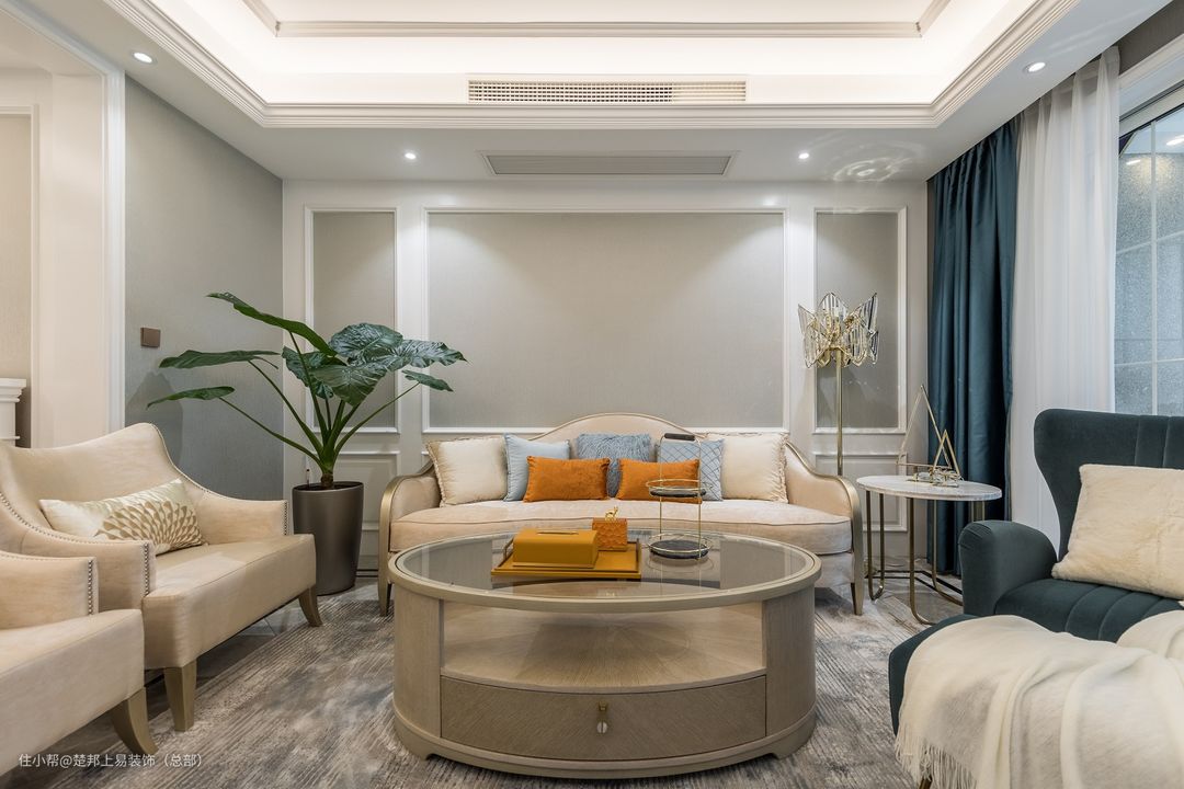 客厅阶梯式的石膏线职称线条装饰,石膏线可以营造出层次感,让整个客厅更加有深度与质感,在轻奢风格的装修中通常会使用一些精致的石膏线条营造出更加典雅、精致的氛围。 跳色的沙发抱枕吸引人们的盐企业,让整体客厅显得更加精致、奢华。