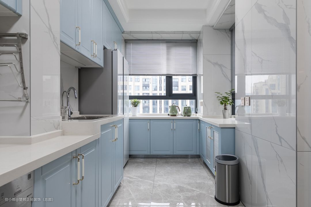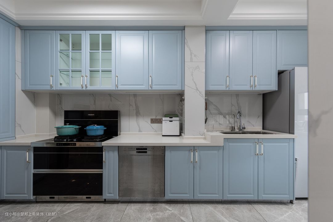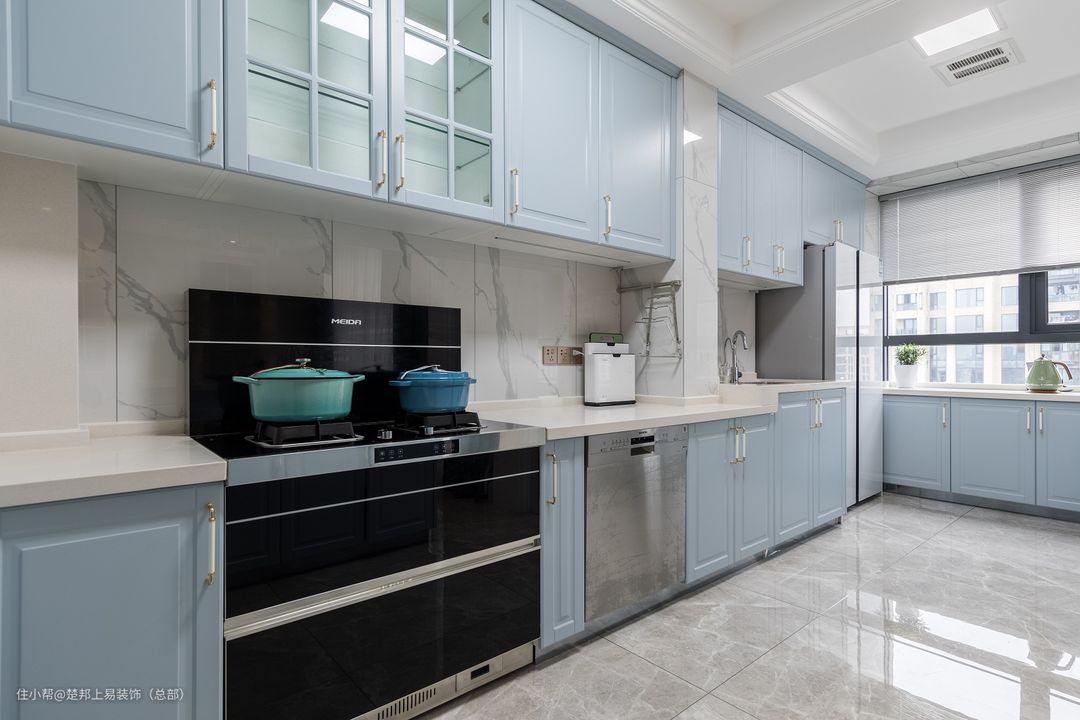 L型的厨房动线合理,厨房白色瓷砖与蓝色橱柜的厨房搭配起来给人一种清醒明亮的感觉,白色的瓷砖让整个空间更加整洁干净,而蓝色的橱柜则为整个厨房增加一些色彩让厨房显得更加生动。
