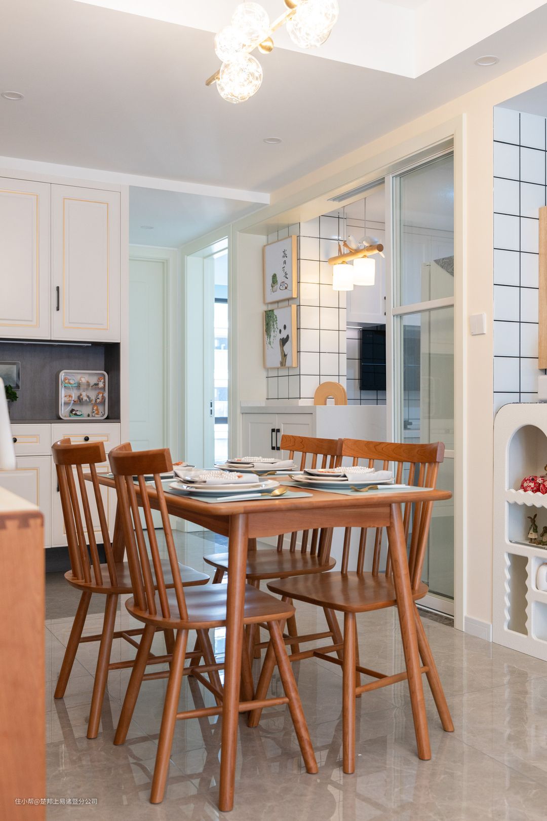 随处可见的艺术装饰画和卡通元素是营造独特复古感的氛围担当,半开放U型厨房设计,动线清晰;透明推拉门,既将厨房里的油烟隔离,又让整个厨房看起来更加明亮、宽敞。