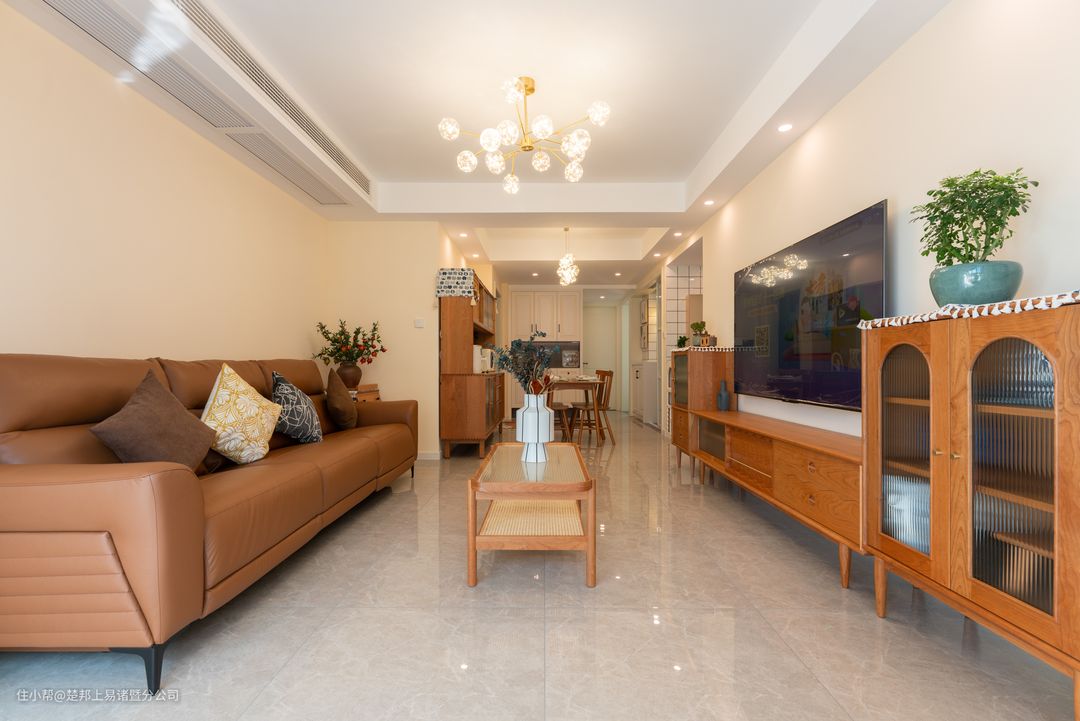 从玄关慢慢步入客厅,细腻舒适的奶油色客厅、轻巧的原木家具、独特的复古咖色沙发,让视觉更加轻盈,空间更加通透。墙角那一抹绿意,就像是画龙点睛的一笔,让整个客厅都变得鲜活起来。 阳台门拆掉,将阳台包进客厅,装上落地窗,阳光照射进来,让房间里的光线变得很好,在视觉上也延伸了整个客厅的空间。