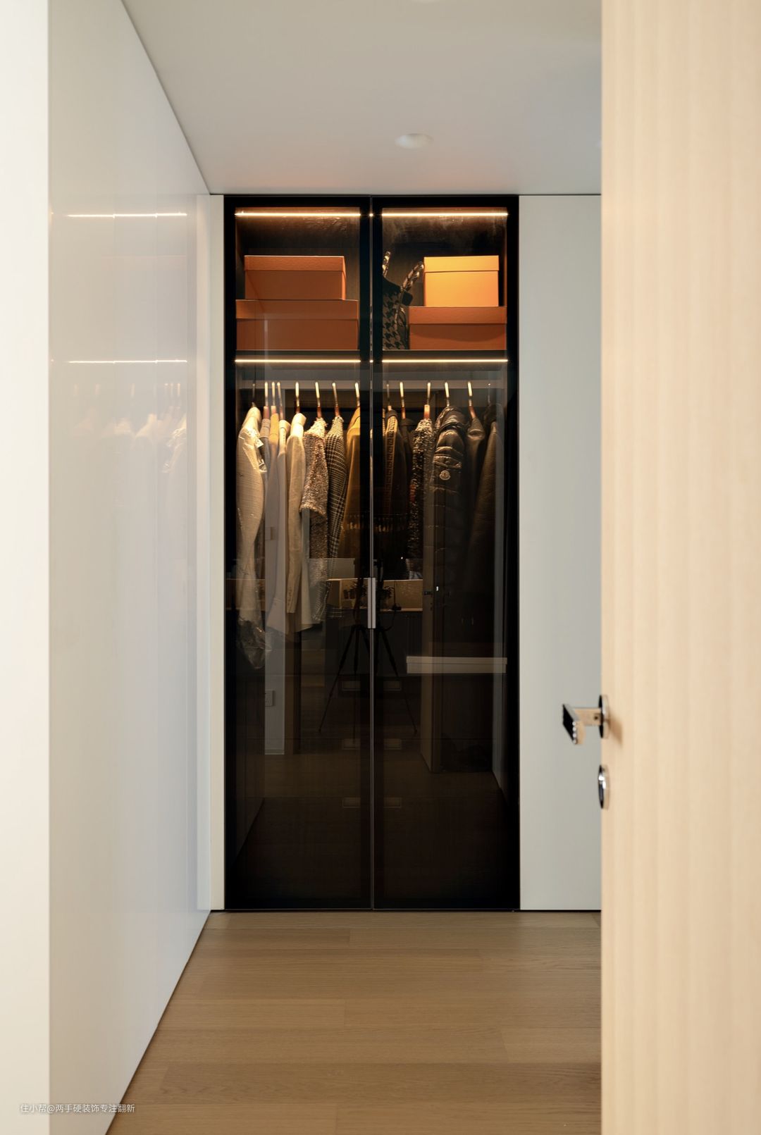 床头柜子是定制柜一起做的。采用的是意大利丽芙的板材,朝卧室一面的衣柜是西班牙芬萨的肤白色。衣帽间挡在了卧室跟主卫之间,解决卫生间门正对主卧床的问题。