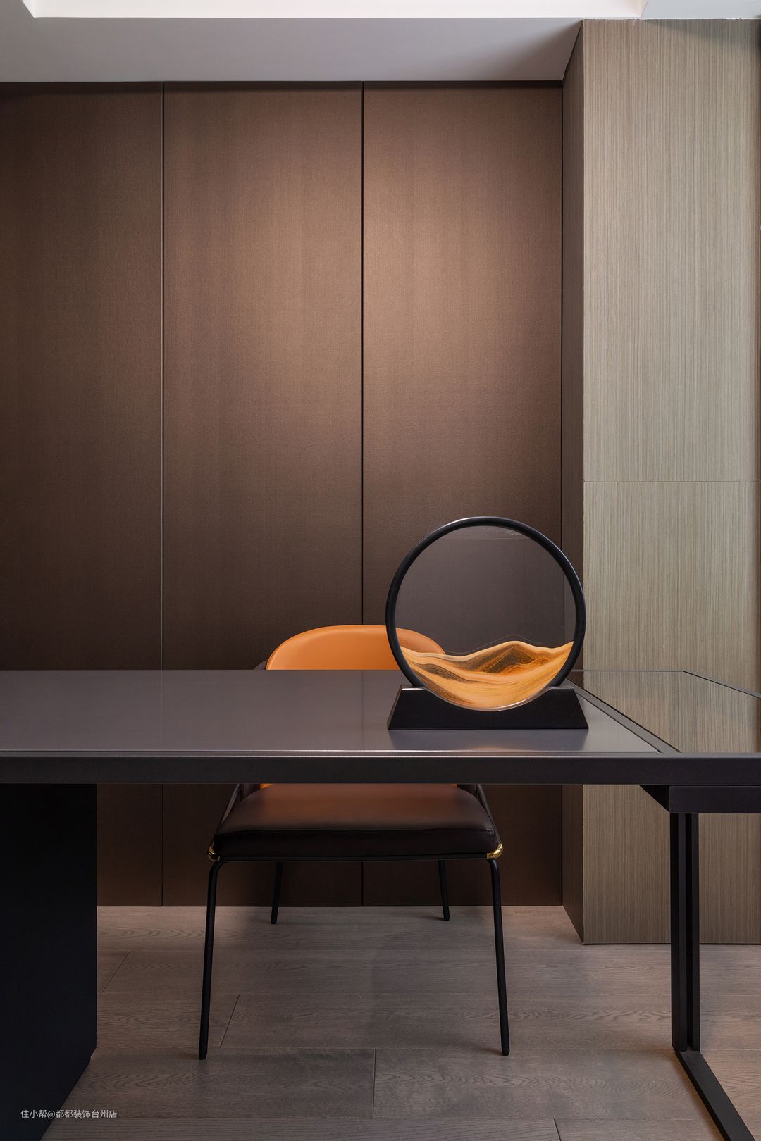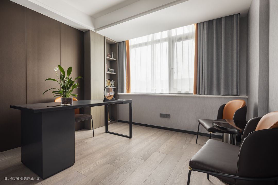书房整体沉稳大气,以深棕色为主基调,再以绿植稍加点缀,营造书香宁静的氛围感,是独处时沉淀思考的理想之地。