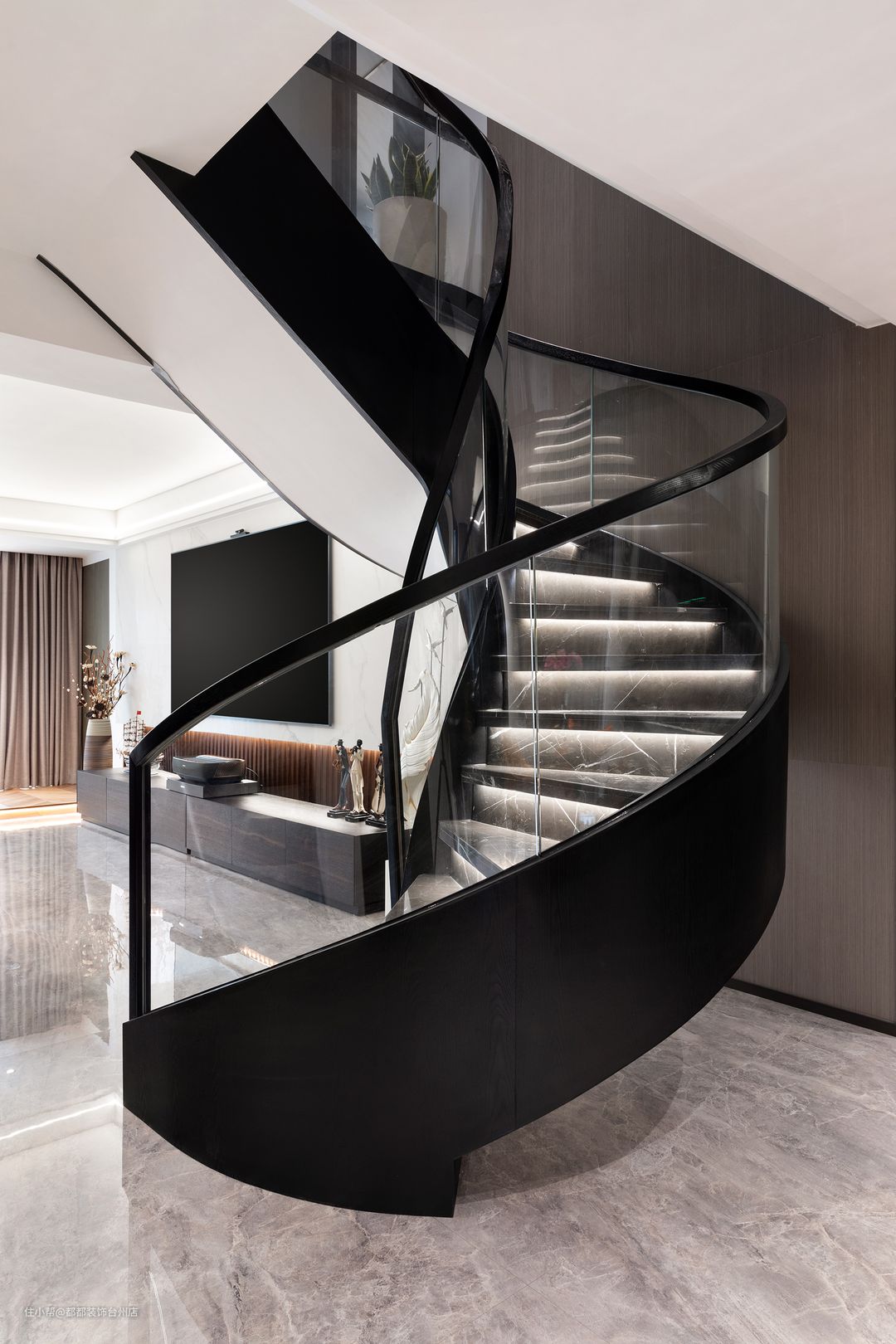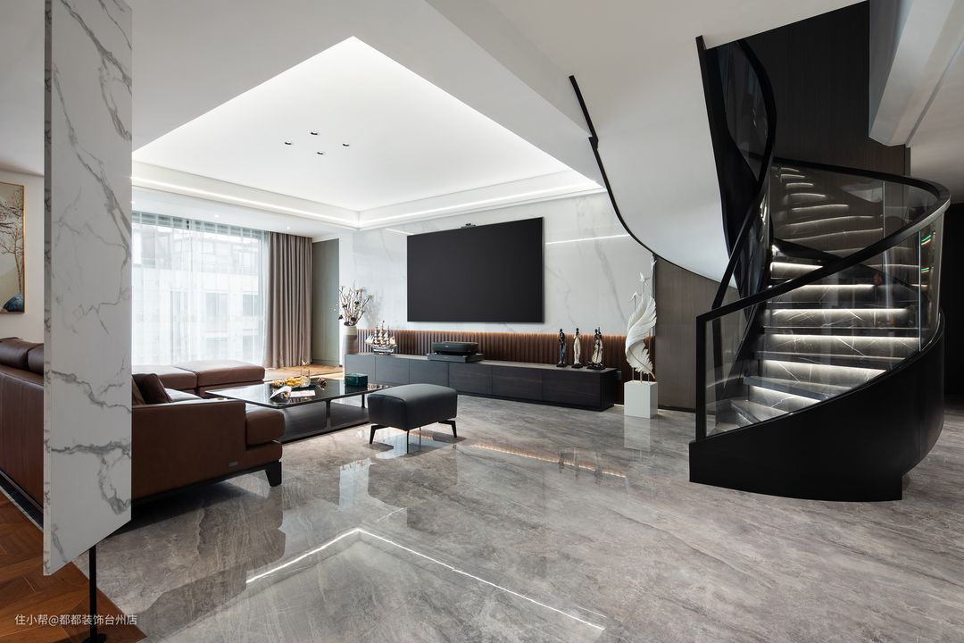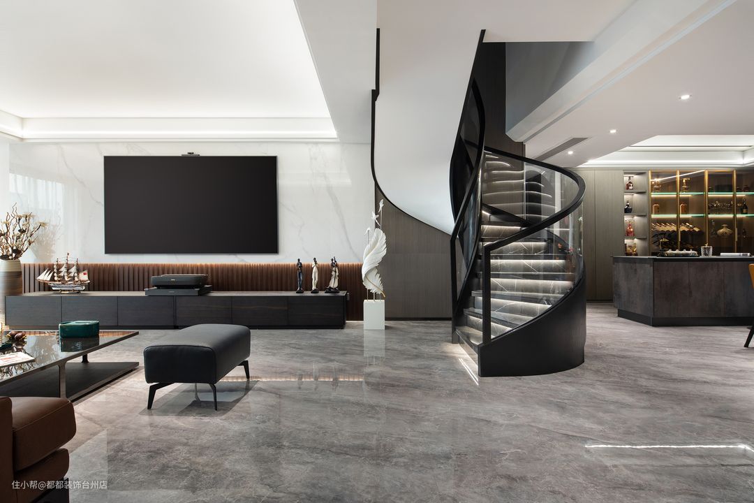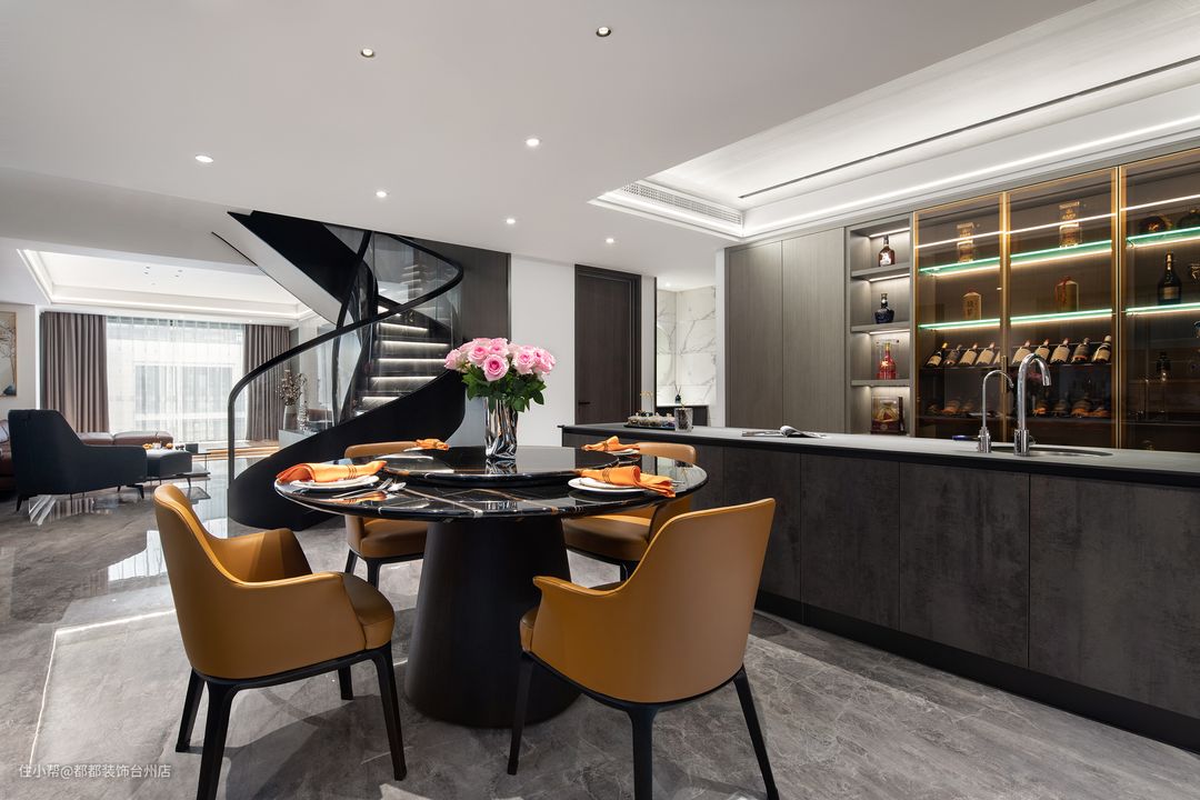 大理石旋转楼梯,酷炫时尚,营造出理性与动感、散而有序的空间体验,旋转角空间的巧妙运用,让家居空间别有味道,无形中起到了分离客厅与餐厅空间的作用,带来更加丰富而又别具一格的视觉感受。