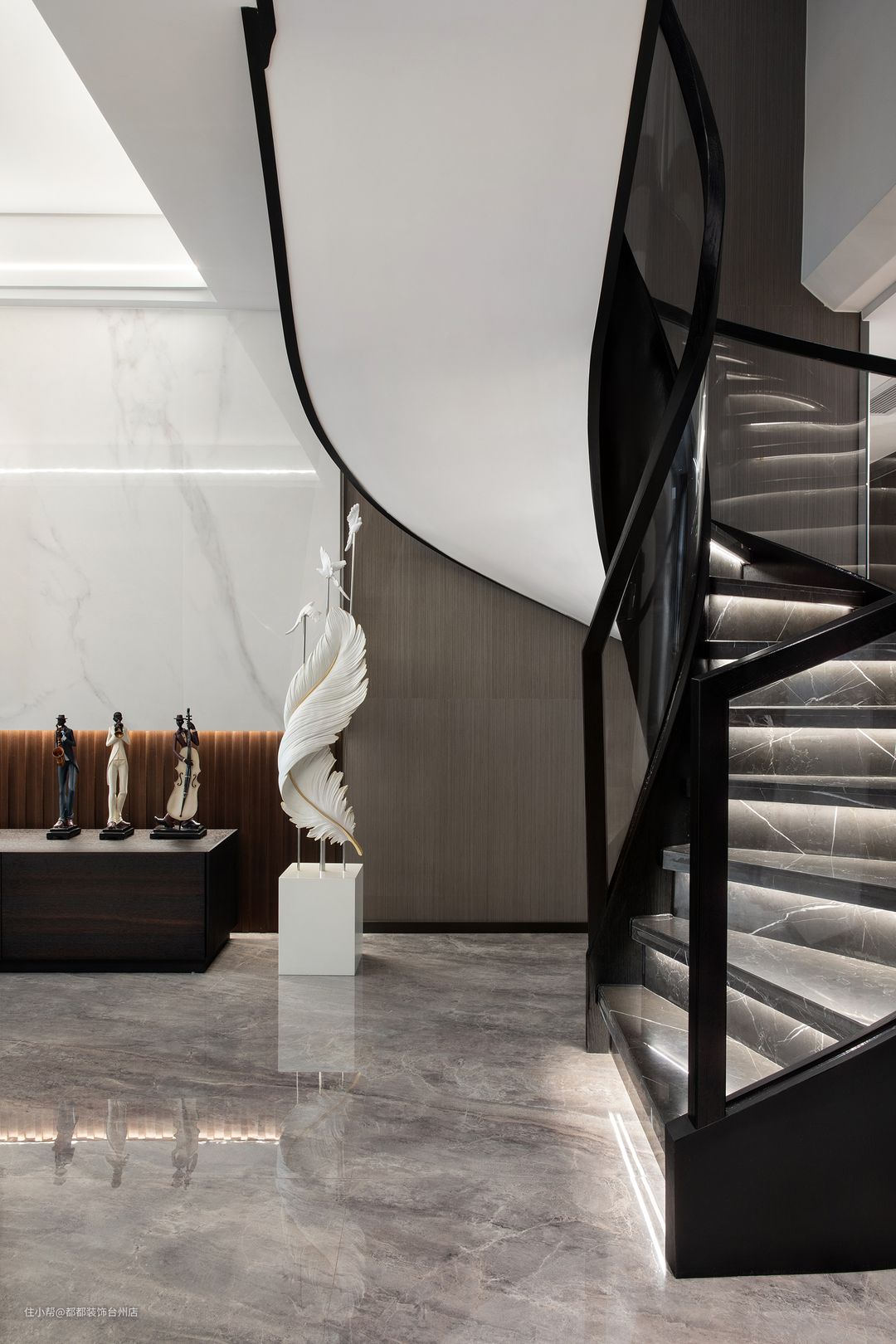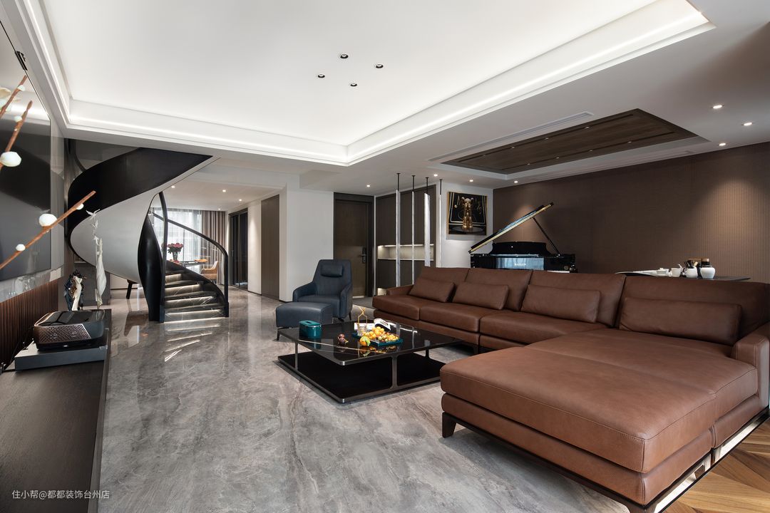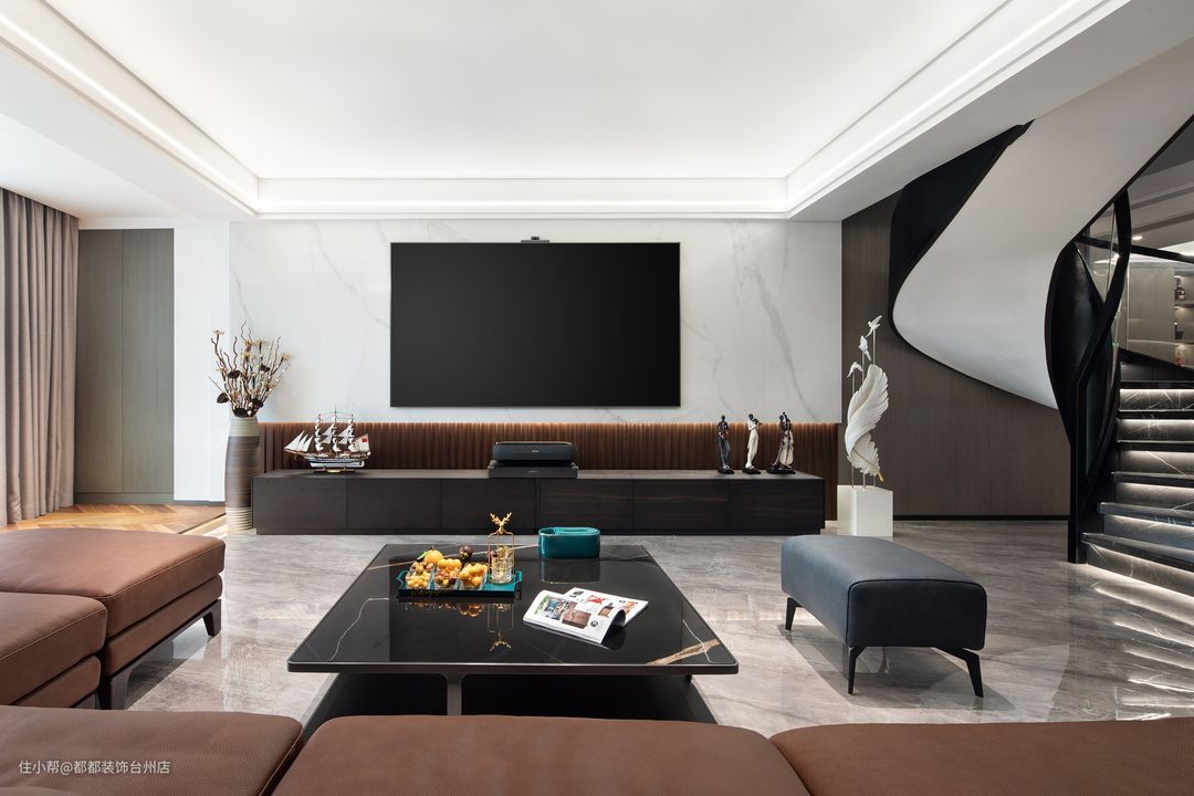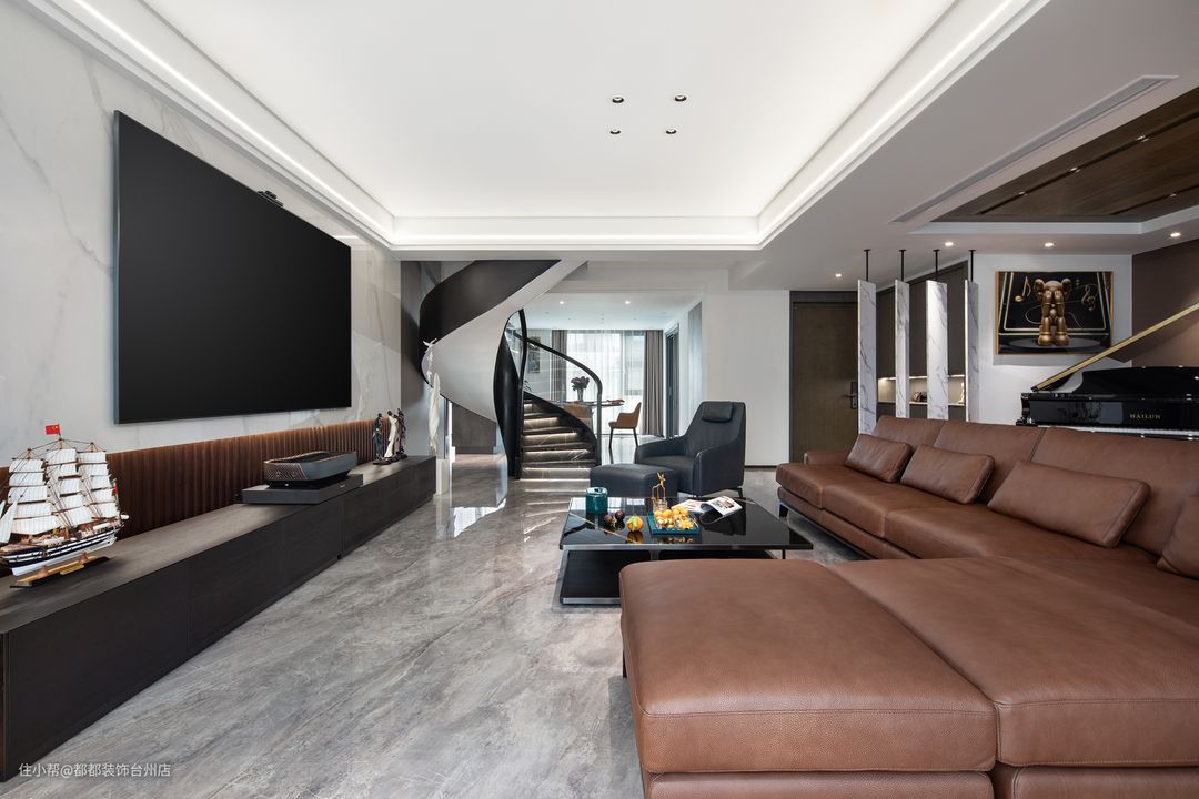 大理石旋转楼梯,酷炫时尚,营造出理性与动感、散而有序的空间体验,旋转角空间的巧妙运用,让家居空间别有味道,无形中起到了分离客厅与餐厅空间的作用,带来更加丰富而又别具一格的视觉感受。