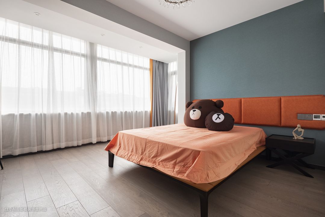 主卧沿袭了全屋的精致与时尚,深蓝色的硬包背景墙搭配亮橘色软包床,两者赋有视觉冲击力的配色调和出摩登优雅的空间基调。 主卧衣帽间设置在主卧内部,没有自然采光的情况难免会给人沉闷的感觉。因此在设计上,这个衣帽间使用了大面积的玻璃门板。玻璃材质通透,还具有镜子的效果,可以反射衣帽间内景象,在视觉上让人感到衣帽间面积翻了几倍。同时业主可通过透明的玻璃门板,更快速的找到自己要拿的衣服,提高了业主的使用效率。