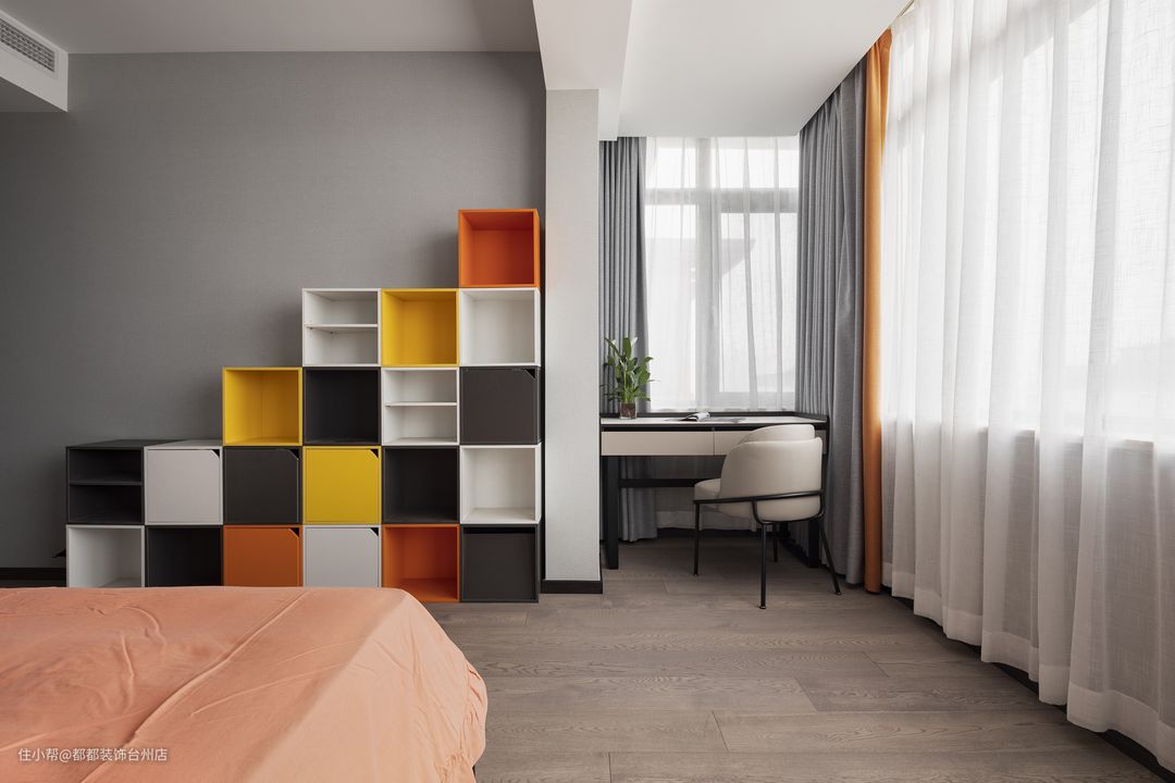 儿童房以年轻色系为主基调,低饱和度的浅绿色与高饱和度的亮橘色相撞,让整个空间充满了活力和童趣。 卧室一角做书桌设计,留给孩子属于自己的私人学习的空间,卧室的方块储物柜外观时尚简约,绚丽醒目,比较实用能装,功能性强,是房间的一大特色所在。