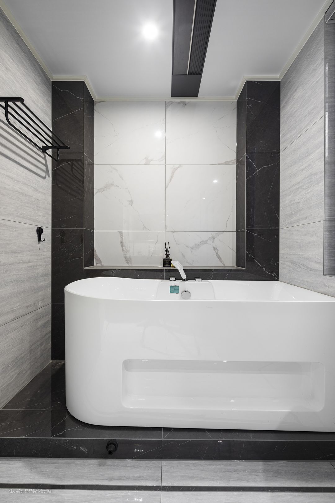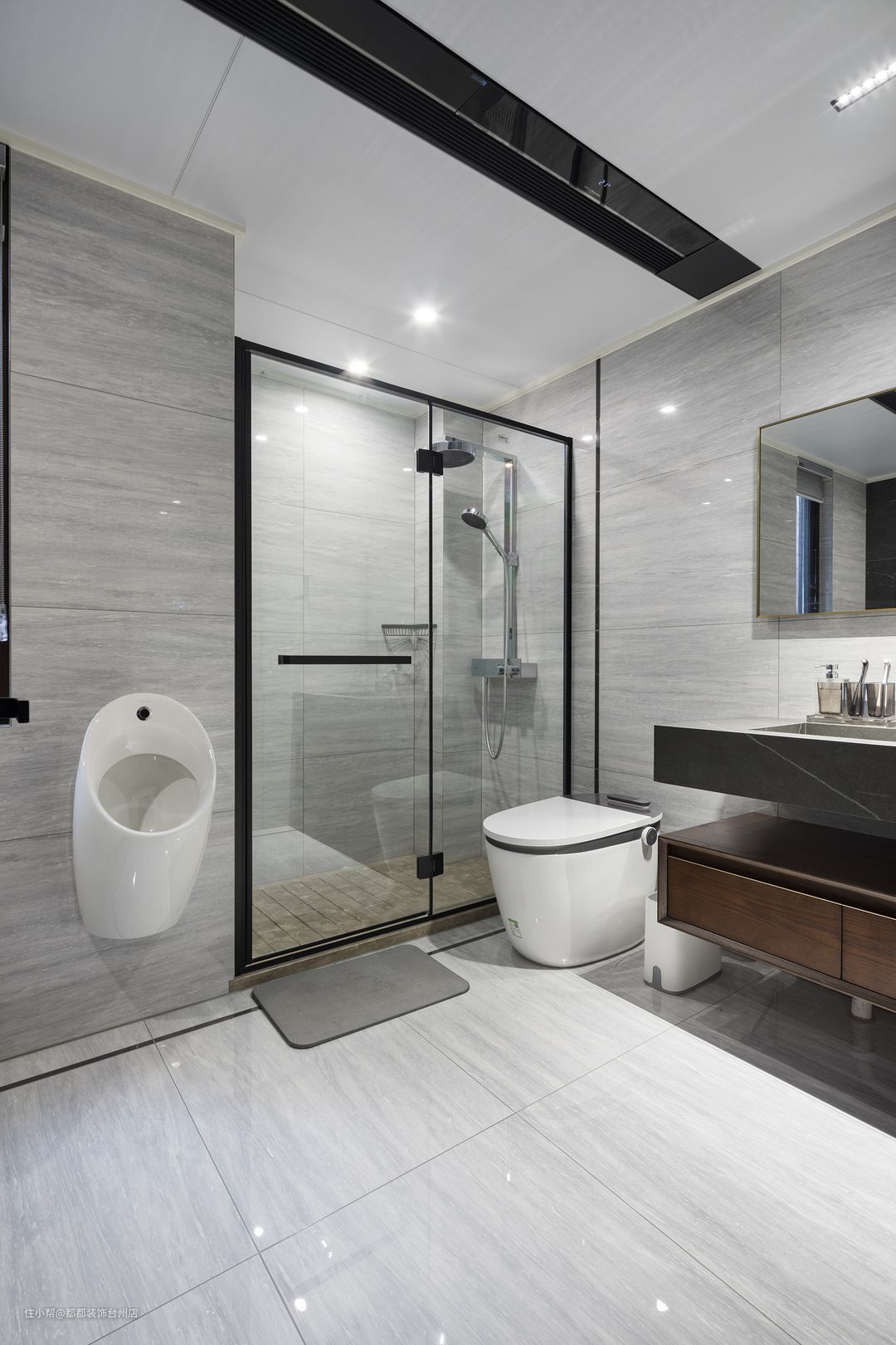 卫浴空间以气质黑白调为主,搭配花纹大理石,不动声色流露出现代都市高级质感,淋浴房的黑色金属边框利落有型,缔造出兼具颜值与实用的舒压区域。