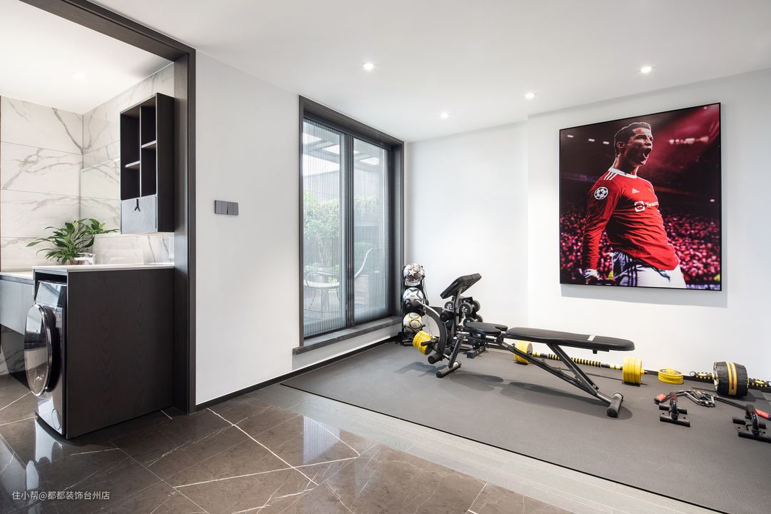 健身区宽敞通透,满足男主人的健身爱好需求。大玻璃窗有利于眺望远处风景,让身心更加愉悦。