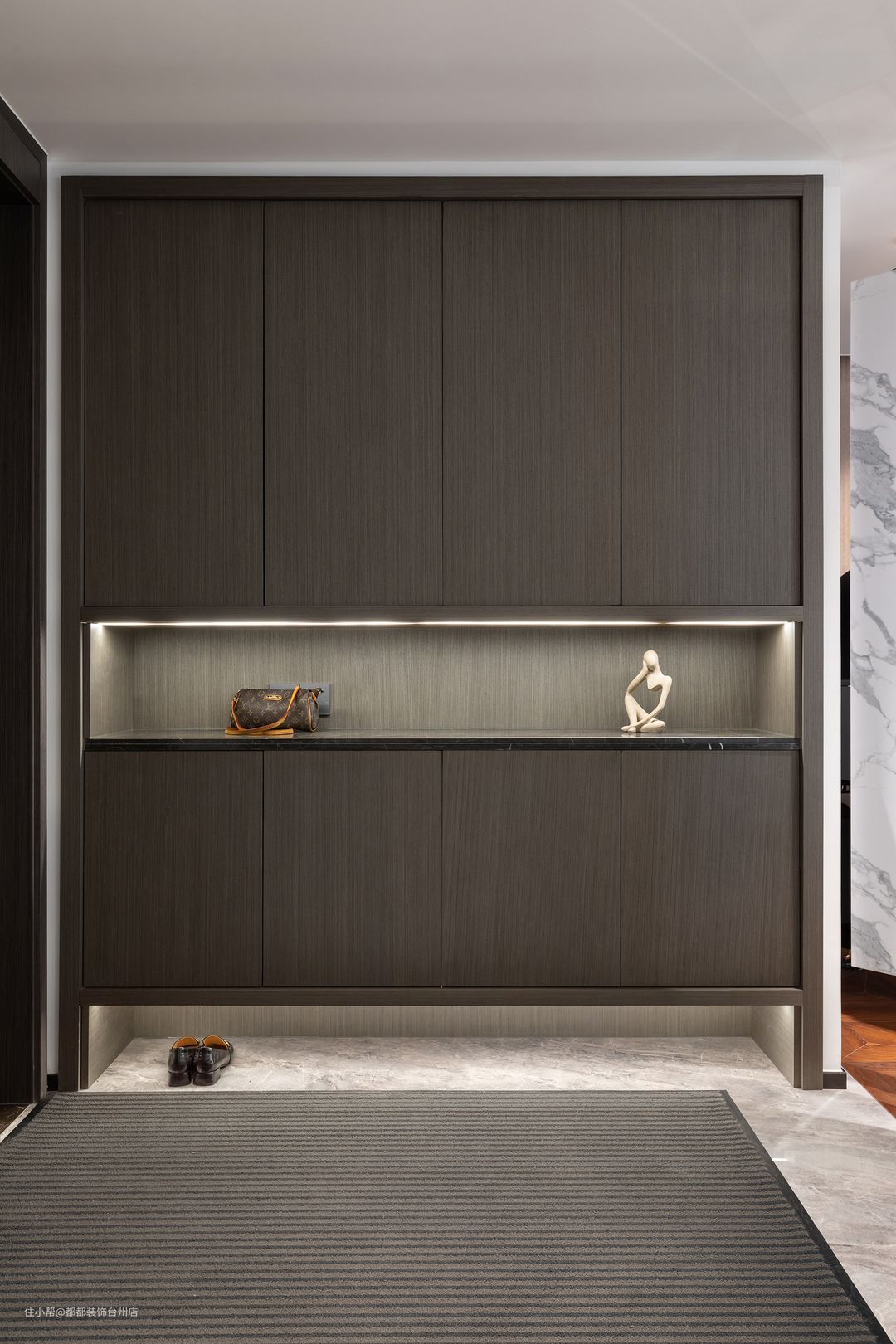 棕色雅致的玄关柜集质感与实用于一身,整体对称的空间布局,陈列艺术摩登的饰品,带来“高级质感”的视觉体验,大理石隔断玄关,既保护了隐私的同时又起到分离空间的作用,给客厅增添几分神秘感。