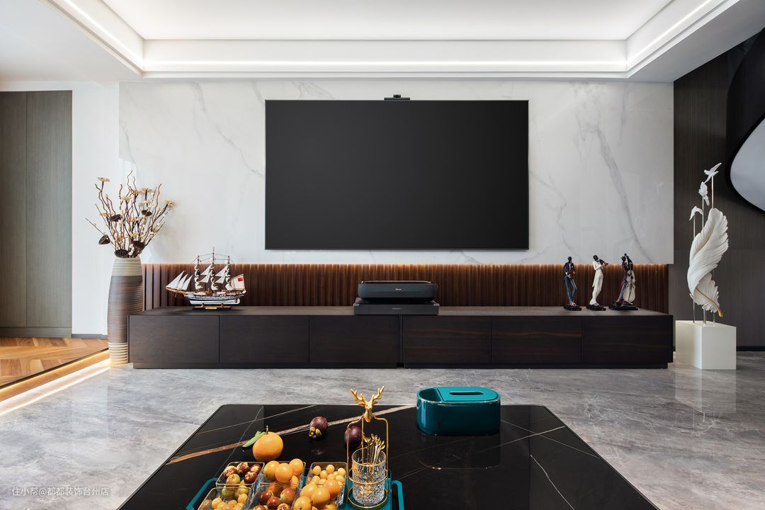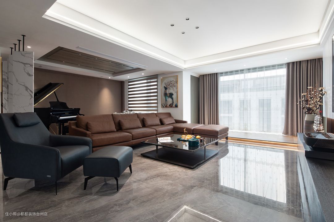 客厅方正大气,开放式的空间宽敞明亮,全屋无主灯设计增强了视觉感和层次感,使光线更加均匀,营造出更加高级的氛围。 高级质感的意式沙发典雅且时尚,圆润利落的线条勾勒出沙发整体立体的几何造型,细腻的软包兼具柔软的触感和温柔的暖意,低调又高级,奢华又时尚,轻奢感跃然而生,给简约的空间内带来了恰到好处的华丽。 整块条纹大理石电视背景墙,利落有型且质感满满,实木电视柜温润厚实,木与石的碰撞与协调将现代轻奢的时尚与内敛演绎得恰到好处,赋予墙面简而美的高级质感。 客厅一角的钢琴为整个空间增添了几分优雅的艺术气息,墙上的画饰,让视觉中心点更为集中,轻奢时尚;另一边是茶房,供女主人品茶鉴茶。阳光透过百叶窗,优雅的琴音搭配浓郁的茶香,让生活充满情调和韵味。
