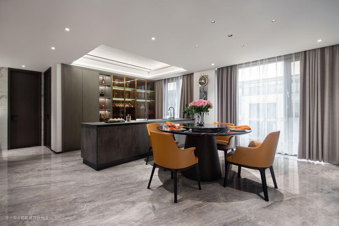 餐厅开阔通透,格局大气,一套圆形的岩板餐桌,为空间凝聚烟火气,亮丽的暖橘色餐椅是空间里行云流水的优雅,让就餐都成为一种精致情调。 全屋定制的满墙柜体,配色与主基调呼应,很好地融合在整个空间里,既满足了日常的收纳所需,也能让主人心爱的美器和藏品得到优雅的展示,成为居室里养眼的独特风景。 西餐岛台满足了夫妻二人对制作简餐、手冲咖啡、品酒等需求,也增大的餐厅储物空间,让生活从内到外都愉悦地鲜活了起来。
