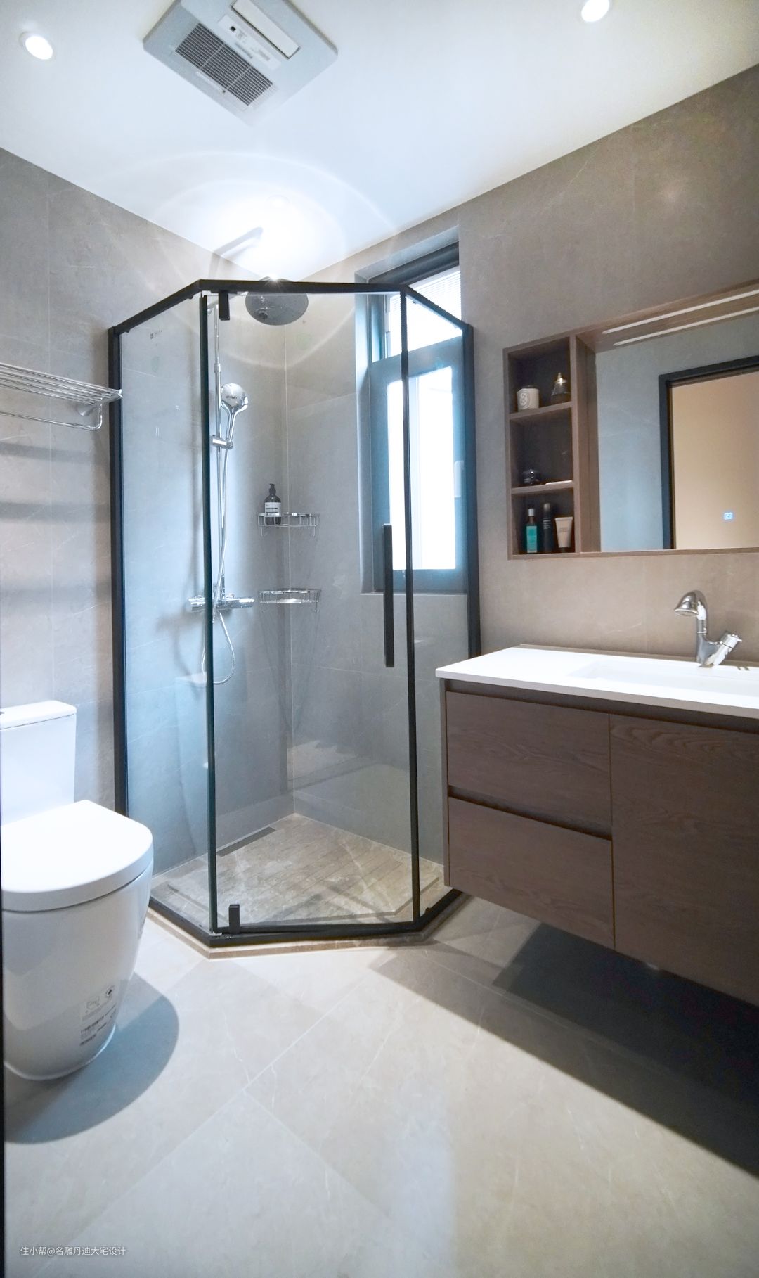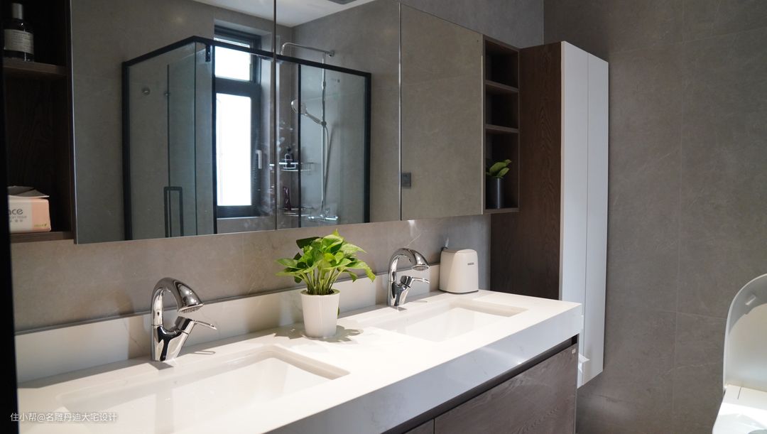 墙角设定约1平方洗浴处,,防滑大理石保障洗浴安全性,此外采用干湿分离设计,减轻卫生间清洁打理工作,提升家居幸福度。 简约的框架线条,硬朗,大气,洗漱池下方收纳柜提供足够收纳空间放置生活用品。空间面积不大,设计师在满足正常功能需求基础上合理规划空间,使得置身其中仍能感受空荡的空间体验。 主卧卫生间相对更豪华,无主灯设计让光线更充盈饱满,照亮每一处死角;三面梳洗镜柜铺陈,将空间通透质感完美呈现,空间视觉愈发被放大;操作台下方收纳柜与侧方柜体确保收纳无忧;双台下盆设计,同能满足两人盥洗需求;在偌大的空间内同理设定干湿分离洗浴区。