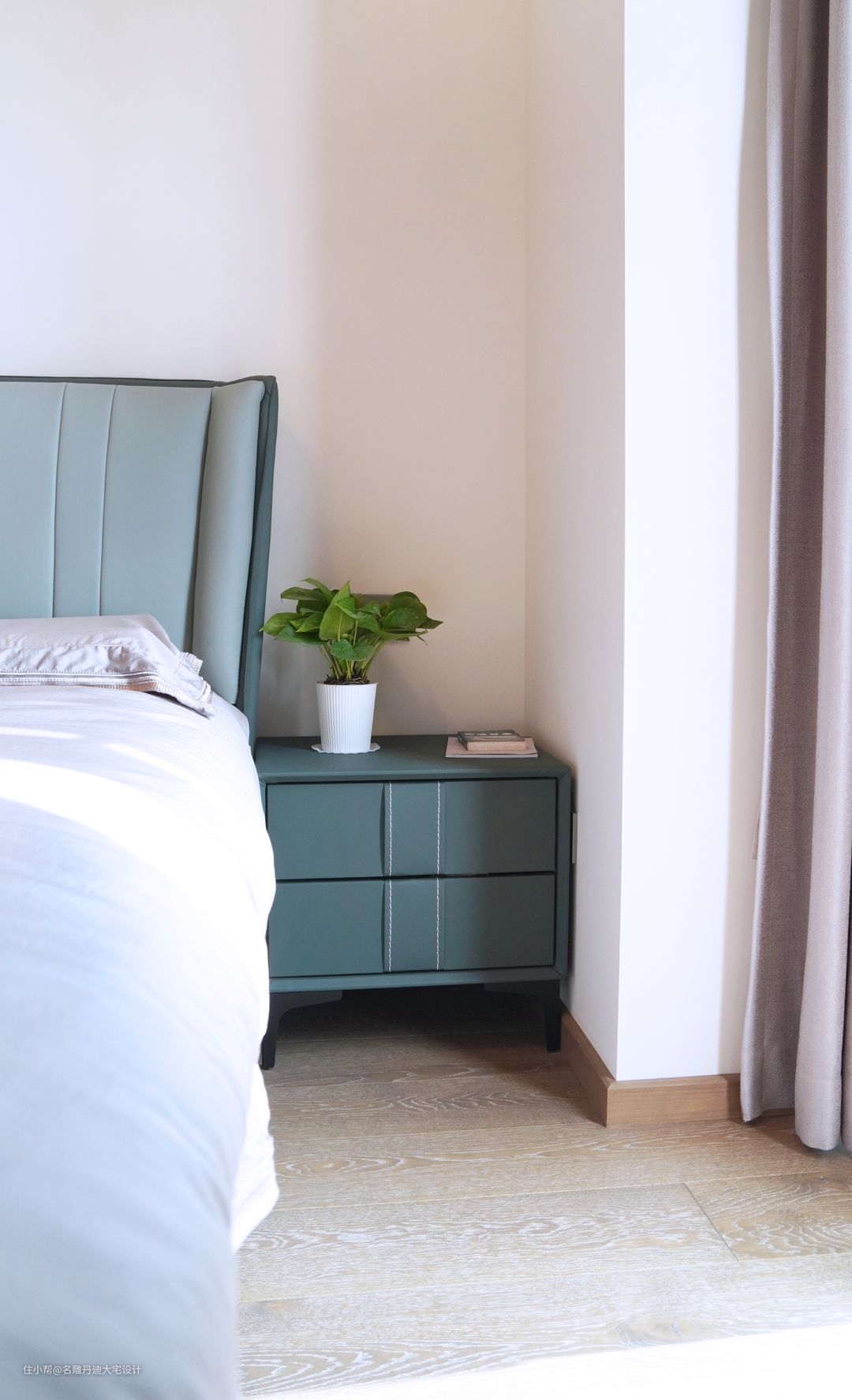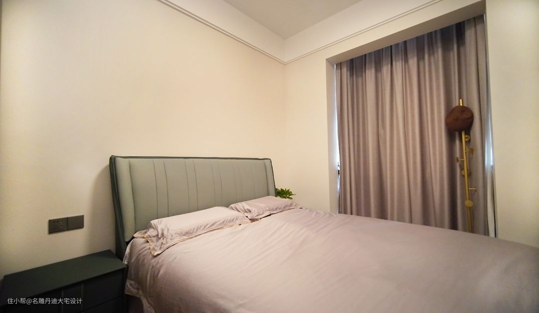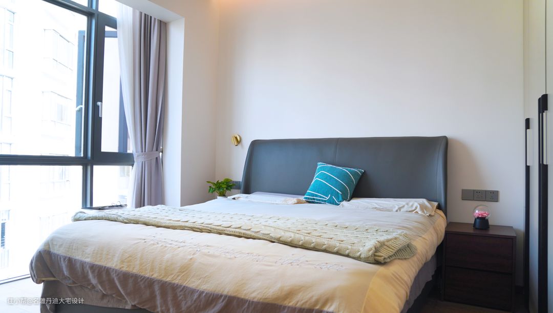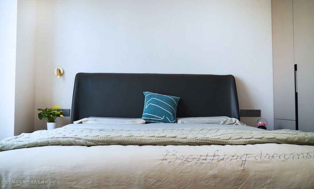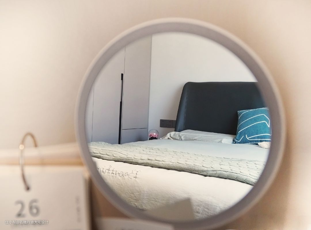 本案在原始结构图上做出更改,设计师打造一间套房,合理缩小主卧面积,给到主卫更大空间。空间色系采用传统的黑白灰设计,结合业主需求,室内设置黑色皮质床具、木制床头柜与少许装饰品,共同打造沉稳的家居氛围。圆形梳妆镜更显轻松愉悦,点缀单调的空间。