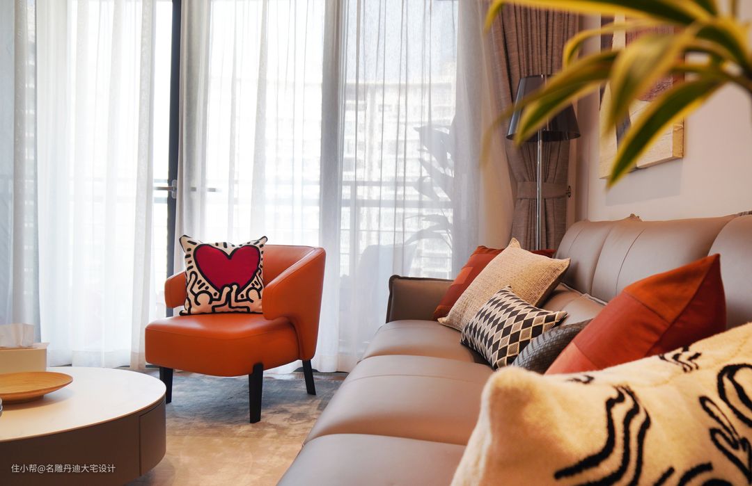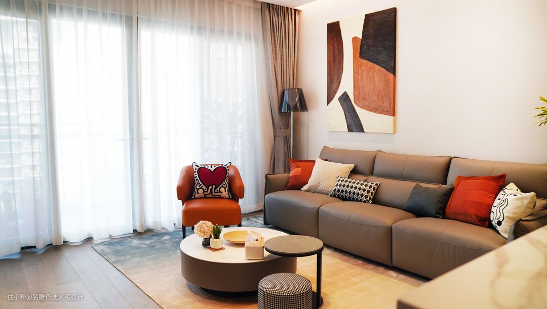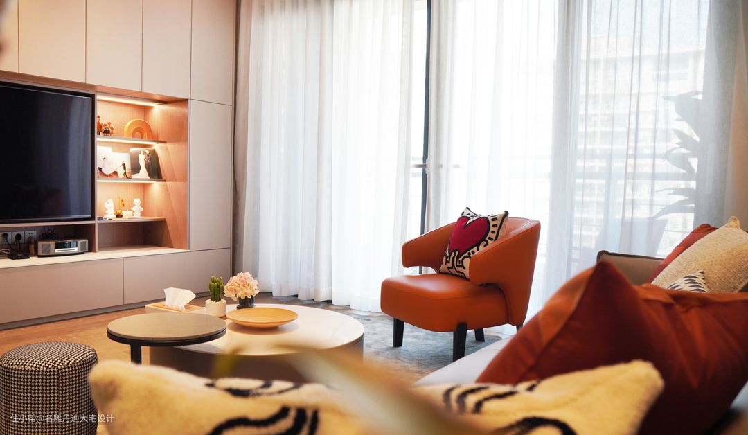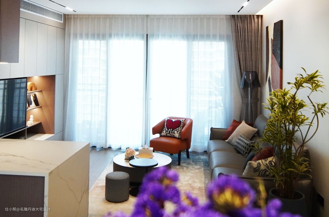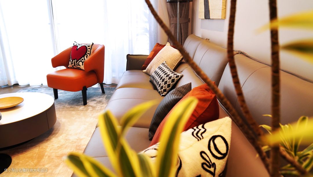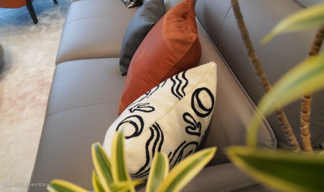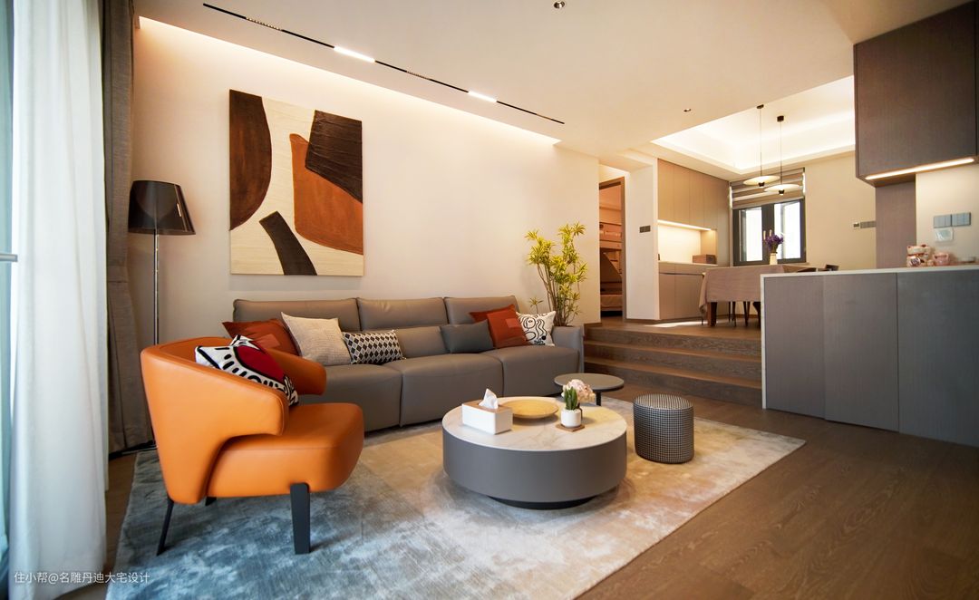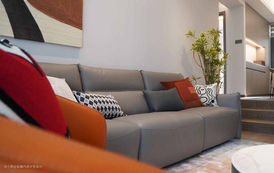 与传统打通客餐厅空间的构造不同,本案入户处呈现温馨的起居客厅,动线往上小台阶设计,其高低落差丰富了空间的层次感,个性且独特。 客厅中色彩的应用相对丰富明艳,渲染一种轻松愉悦的家庭氛围。材质的运用以舒适为核心理念,避免了杂乱无序的视觉干扰,多样且具有层次。电视置于墙体收纳柜中,节省空间并提供多样收纳功能。浅灰色皮质沙发饱满柔软,无束缚的触感反馈足以满足任何坐躺需求。绿植装点、现代抽象画作还原最原始粗犷的艺术氛围。