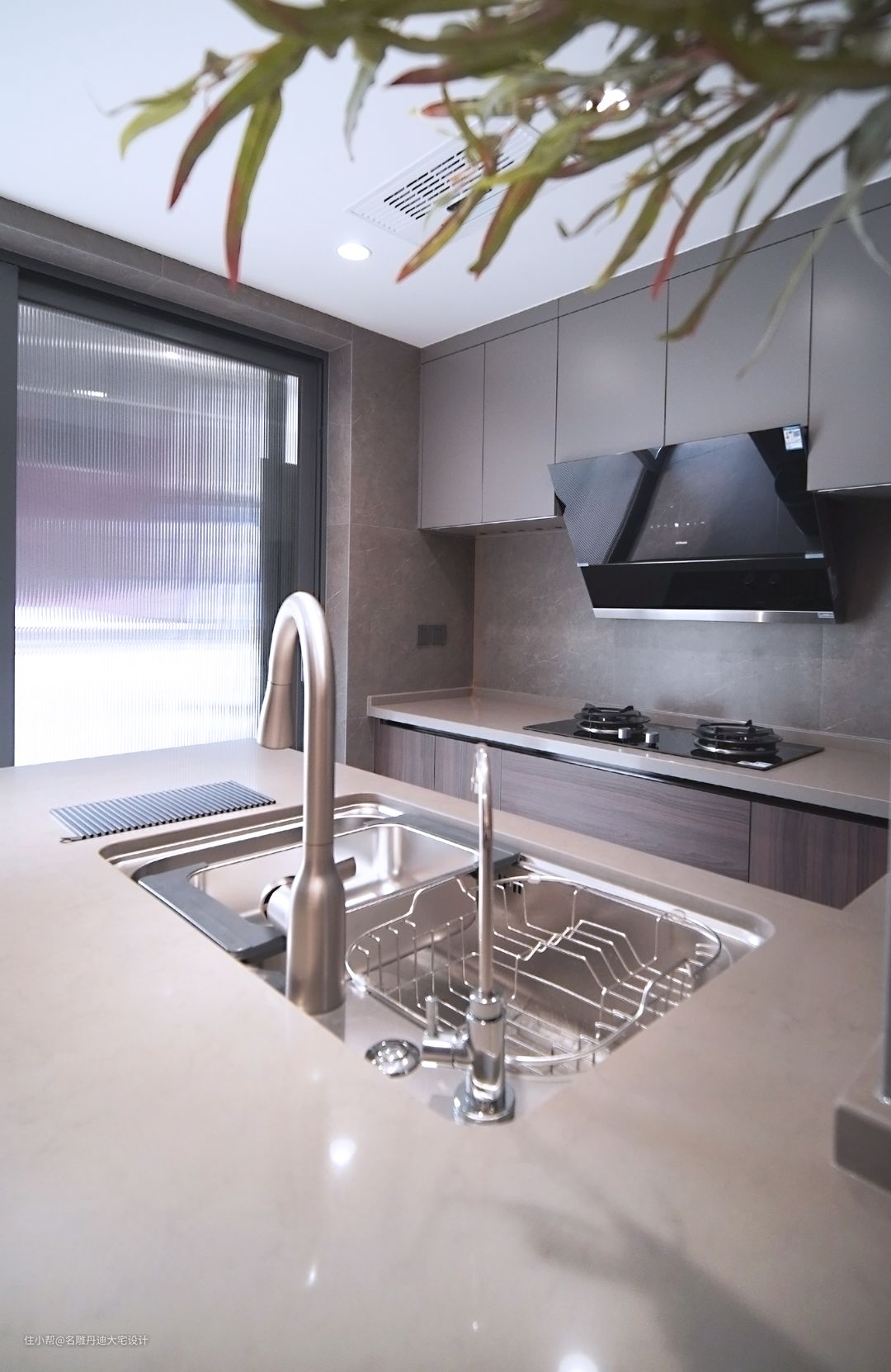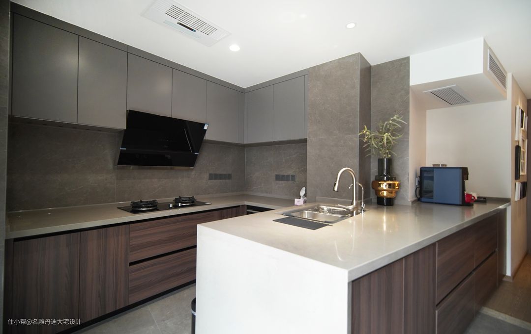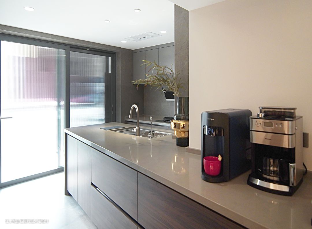 本案厨房空间不大,且不方正,因此设计师采用开放式厨房设计连贯空间,落地玻璃门窗设计增加光线覆盖率,沿着入口处设定操作台,因而通道处和烹饪处皆可“实用”操作台,空间结构设计能够满足厨房多项功能需求,丰富动线的同时打造吧台氛围感,增加空间情趣。