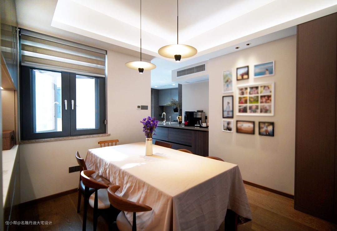 客厅与其他空间衔接处放置一张餐桌,合理规划空间。方形长桌可满足多人进餐需求,在暖色灯光的映衬下,木质地板与白色桌布共同构成一个质朴简约的空间视觉。此外,设计师预留白色墙体,将此处作为家庭合照展示区域,共同呼应其乐融融的家庭氛围。