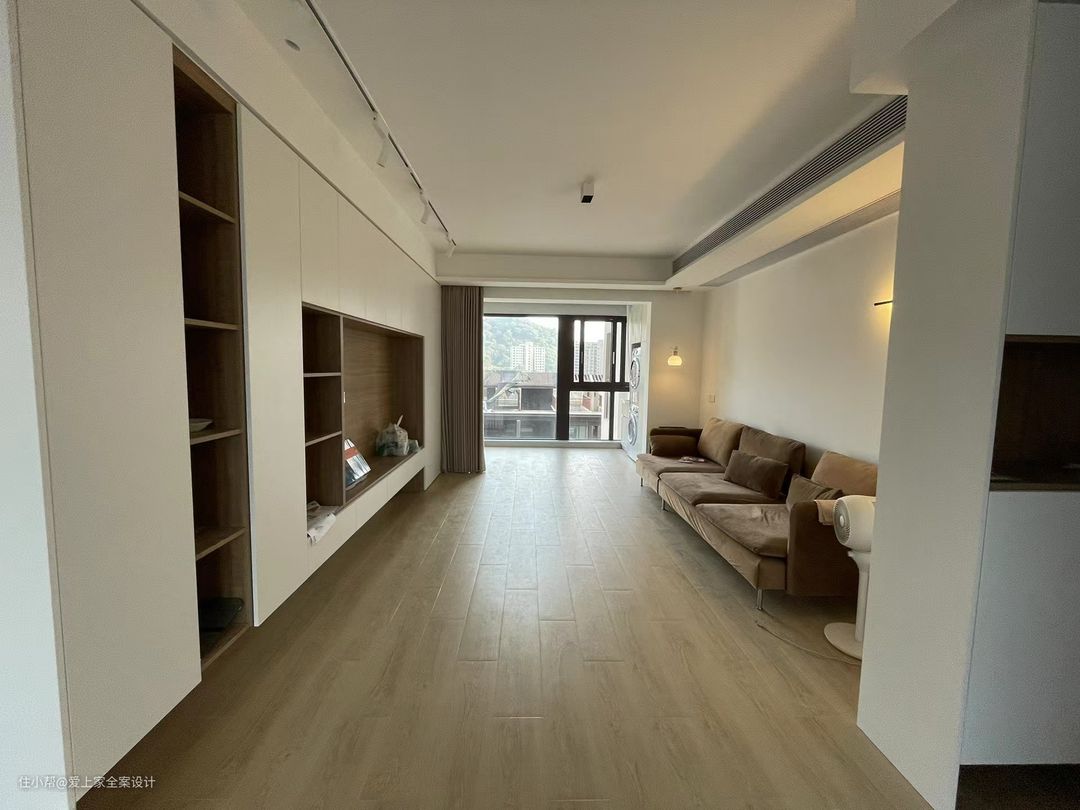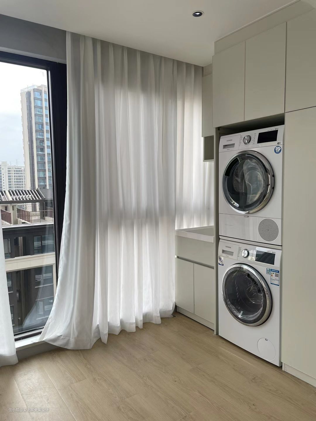 阳台我们设计了传统的洗衣区,并且吊顶做了隐形晾衣架,洗晾晒一体化,动线合理美观。