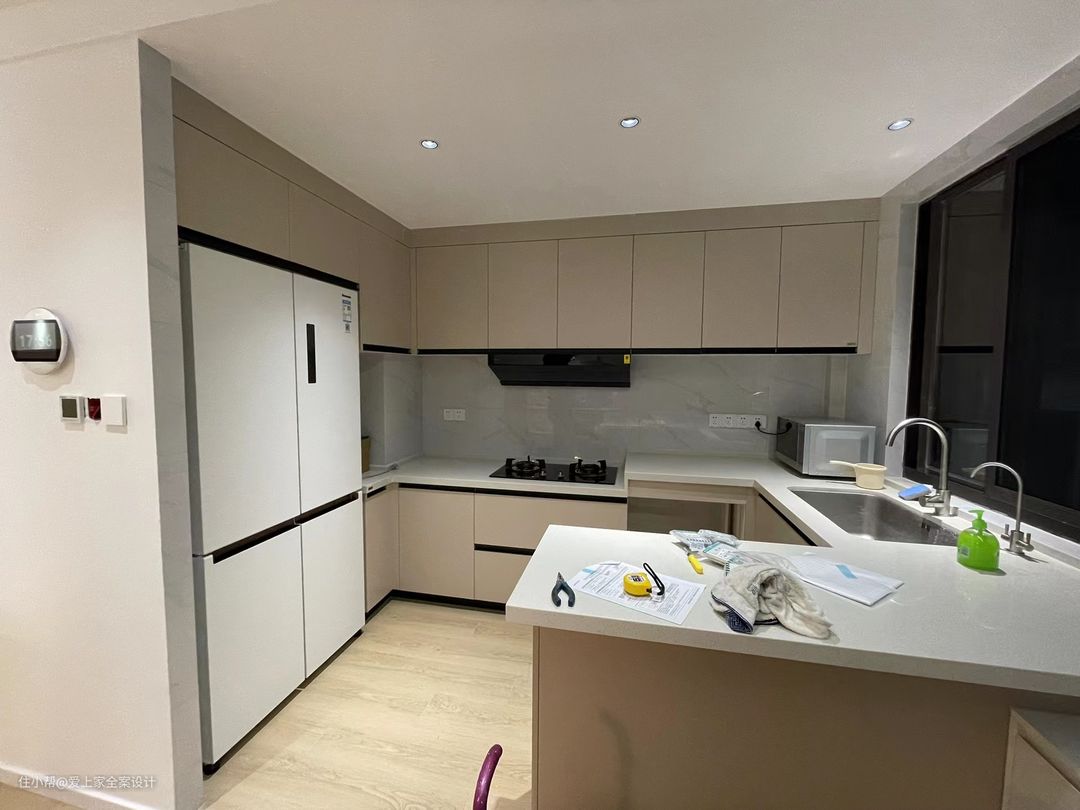 厨房我们做了岛台发的设计,哑光橱柜搭配上白色大理石台面,使得整个空间更加有质感和设计感。