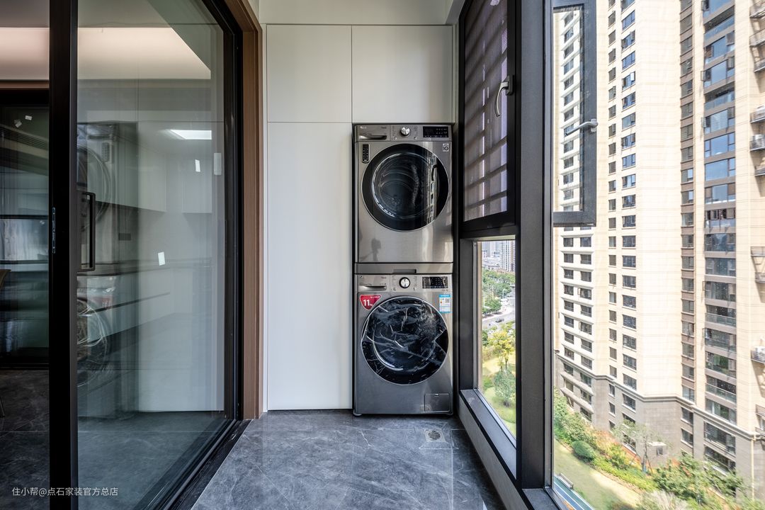 阳台与客厅做了隔断,玻璃的平开门设计,不影响光线也隐私性也会显得更强;洗晒一体的设计,空间实用简洁。