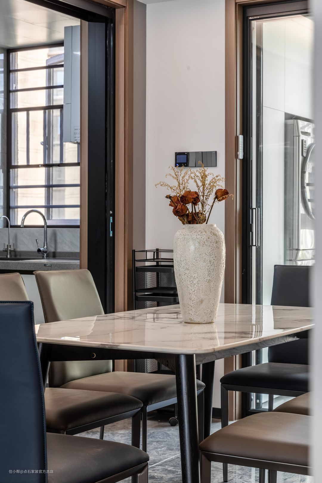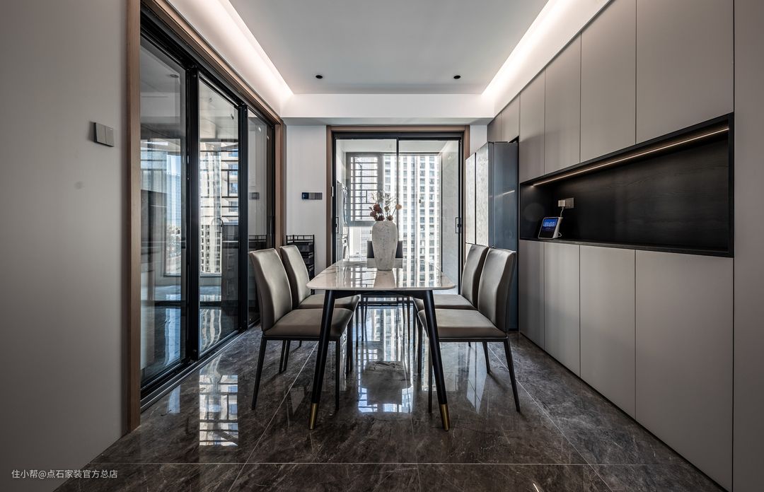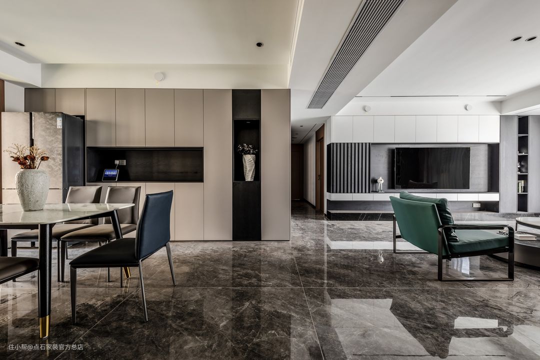餐厅,格局上餐厨一体,但为了扩充厨房的空间,所以餐边柜留出了冰箱的位置,动线上也更加舒适与方便。
