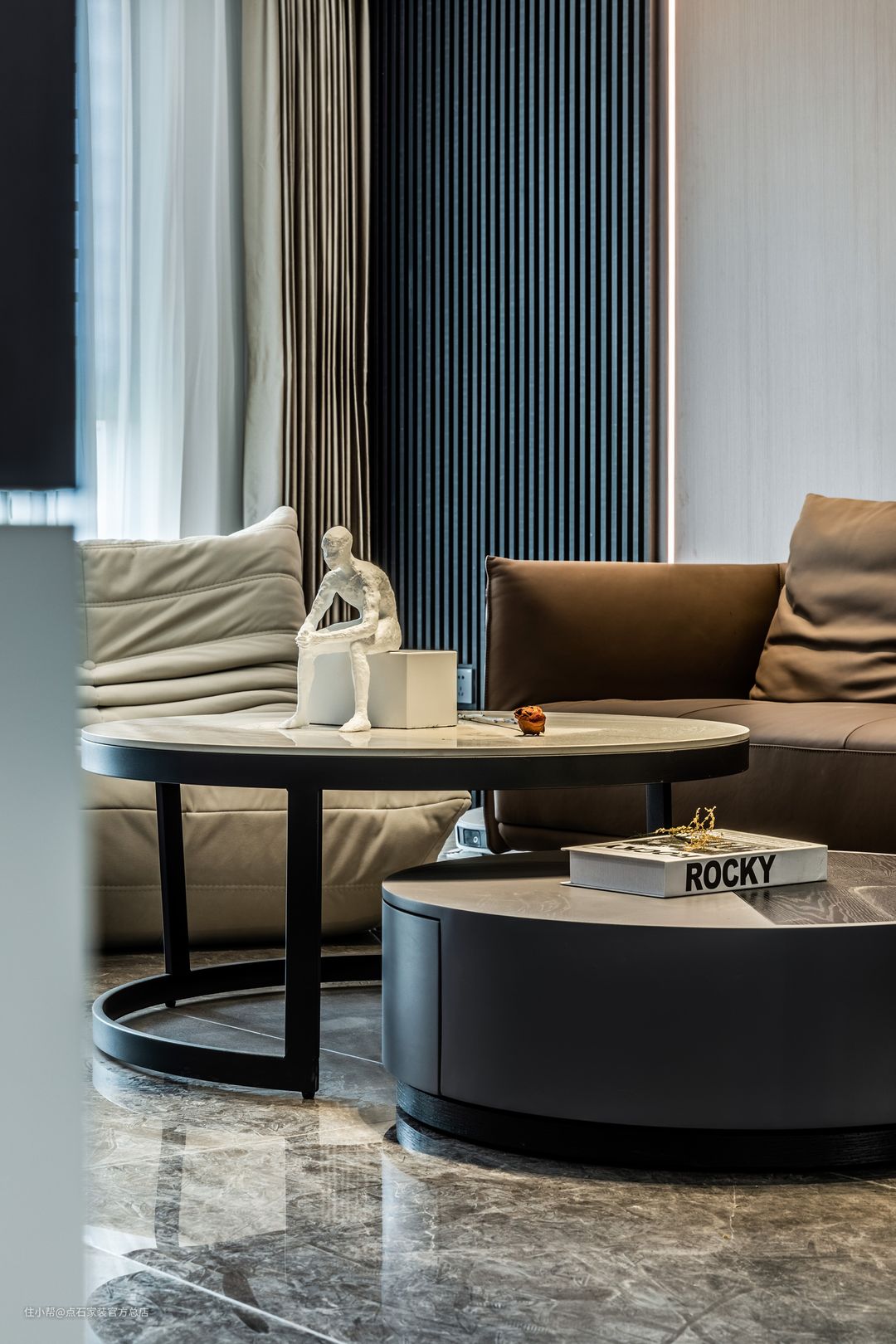 客厅,整体以黑白灰风格为主,在墙面的应用上,更加注重收纳与美观的统一。在灯光设计上,采用了无主灯设计,均匀的照亮了整个客厅,颜色也参考了原木与白色的相近色系,这样颜色更加均匀。