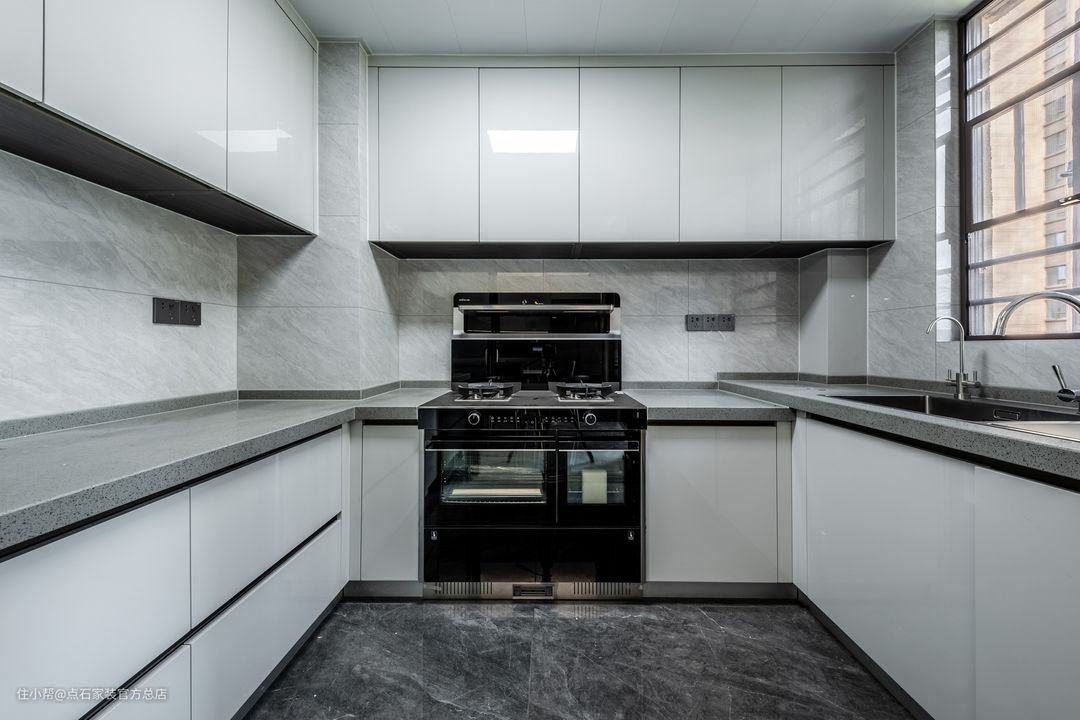 厨房,整体以白灰为主,U型布局,洗切炒动线明确,也让整个厨房的体验感更佳,也更加干净。