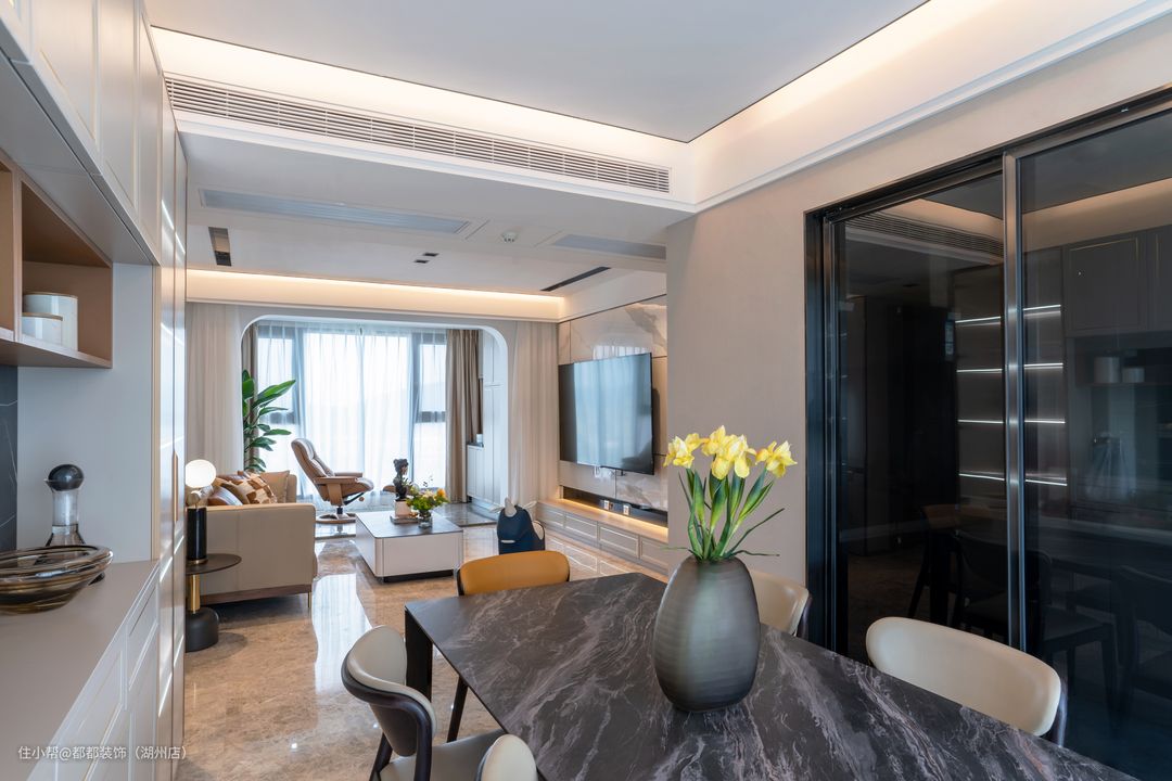 客餐厅一体化,客厅阳台全部打通,纳入客厅,空间宽阔敞亮,采光更为通透,无主灯设计简洁利落,多重光源营造出不同的风格的氛围。 沙发背景由原来单调的白色乳胶漆铺设改成了硬包,在色系上选择了太空灰,作为背景色,点缀的恰到好处,再加上整体样式上的不规则分布和一整圈的金属线条,使原本沉闷的墙面变得轻快又精致。 在家具的选择上,材质选用了进口头层牛皮,搭配黄铜金属高脚,这一组合使得沙发的光泽与质感都达到了极致,而在颜色上仍然采用大面积的浅色,在保持整体色调一致的基础上,利用抱枕的颜色进行深浅的对比与点缀。 电视背景墙选用了白色大理石,鱼肚白的颜色加上灰色的花纹,与黑色大理石桌面茶几作出强烈对比,使得空间明亮又高级。 一排落地抽屉满足储物功能,抽屉的样式上加入了金属线条,低调却又不可或缺。石材与木材的碰撞,奇妙又契合,两者结合,处处透露着新房现代与轻奢的风格。