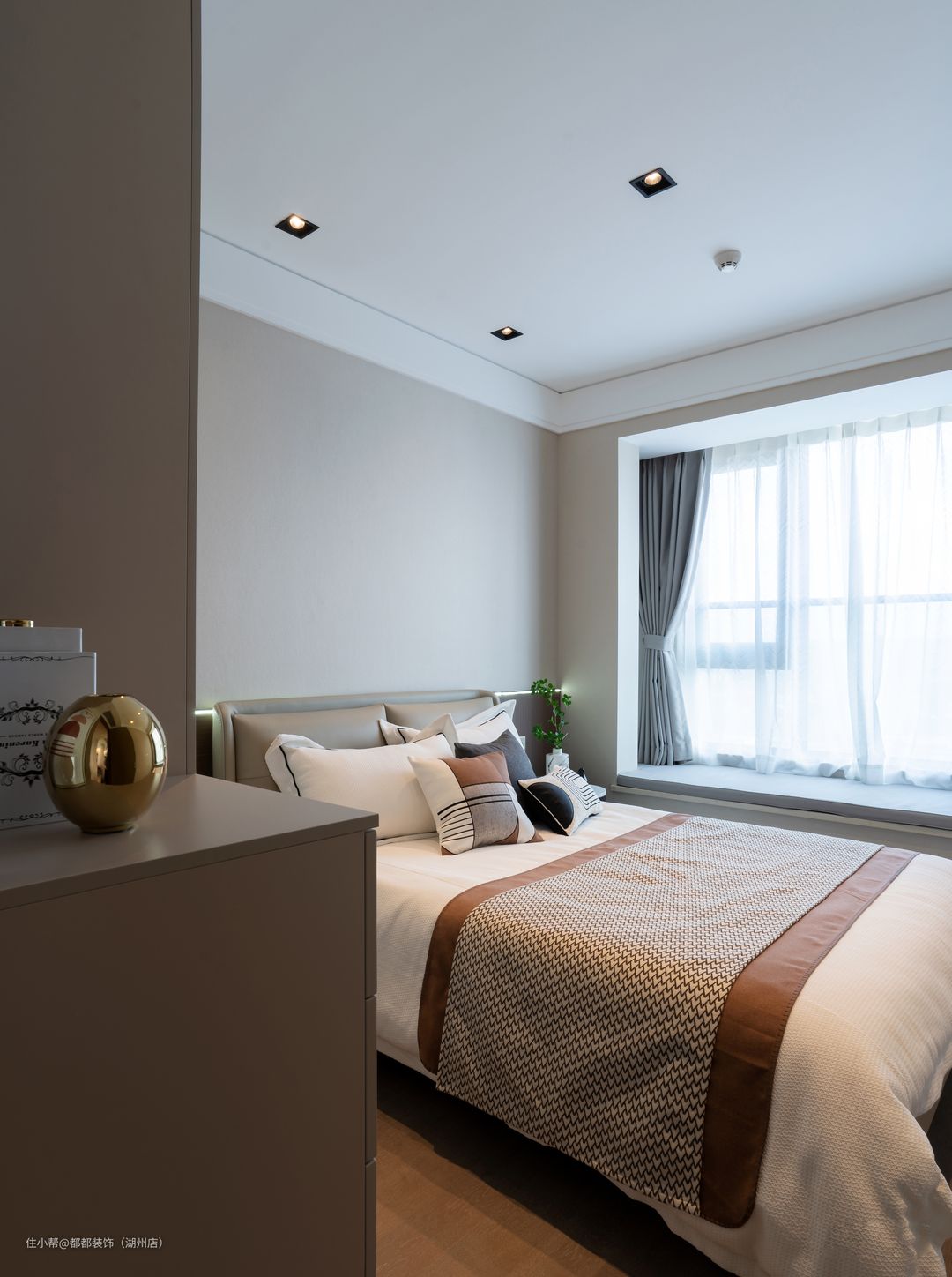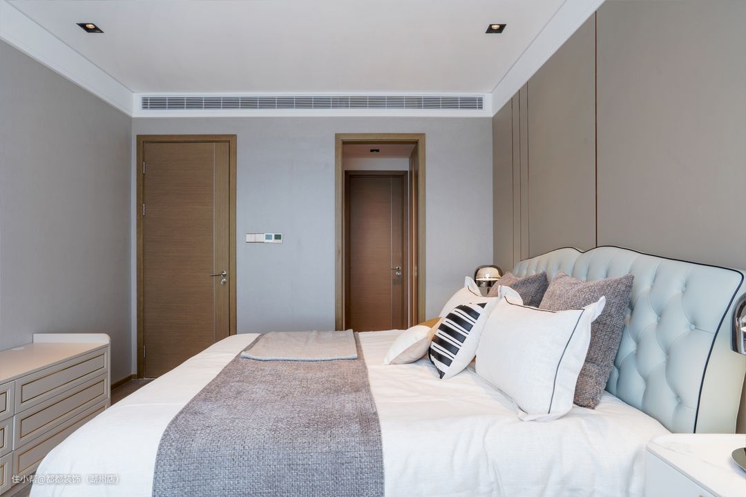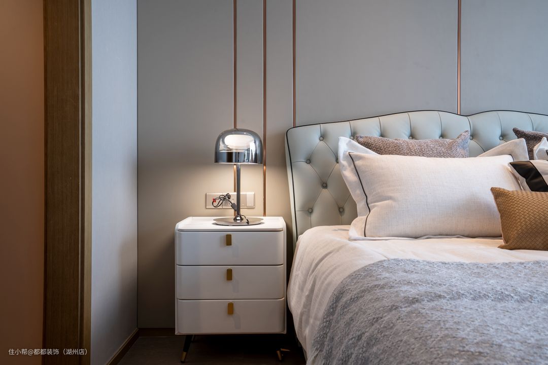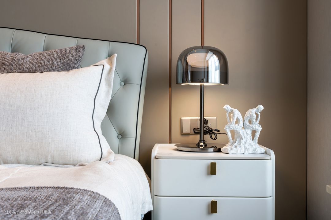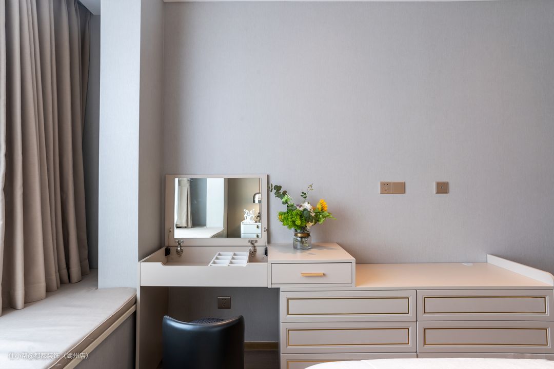 卧室往往给人一种令人心安的沉稳感,洗个热水澡,被柔软蓬松的被子包裹,在柔和的灯光下,放松身心,而后进入甜美温和的梦乡。 次卧的设计更注重简约舒适,米灰的墙面搭配木饰面的床头背景,床品以素色为主,柜子颜色与墙面相呼应,营造一种沉稳安静的氛围。 主卧背景板采用温馨的浅咖色,黄铜金属线条做点缀,搭配手工拉点工艺真皮大床,凸显质感,精致而舒适。 实木一体化的梳妆台,把储物空间做到最大化,温柔的用色从里到外都透露出一种内里的静谧婉约,与整个空间的格调十分相符,金色线条的点缀显得更加精致典雅。