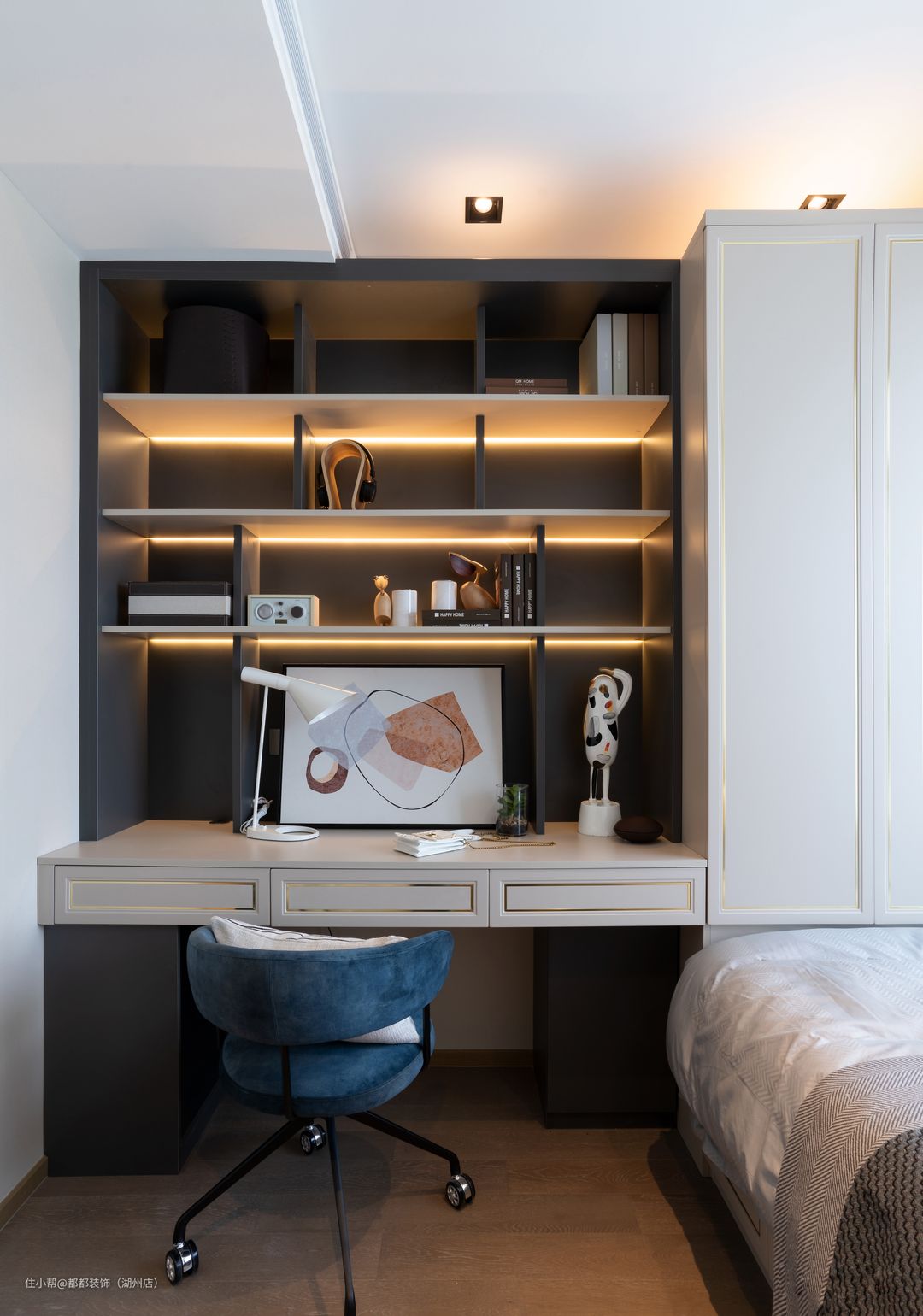 多功能房的设计完美利用了飘窗的空间,简欧造型一体化定制书柜+衣柜,深灰色当做侧板和隔板,保证颜色搭配舒适又和谐,在功能空间上兼顾书房、休闲区的自由切换,让空间使用率达到最佳。