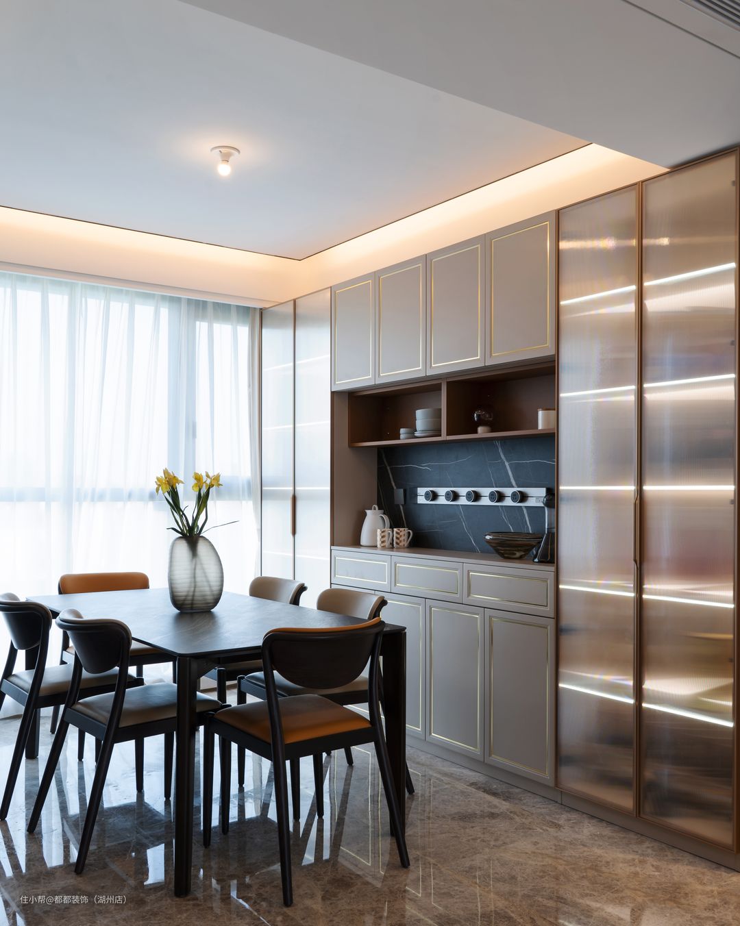 本户型是双阳台的设计,朝北的餐厅,附带北阳台,采光非常好,餐厅的设计以简洁大方为主,满足女主人实用和温馨的需求。 餐边柜的造型顶天立地无死角,中部镂空的局部留白使得空间不会过于压抑。两边的高柜柜门采用了金色边框的长虹玻璃,作为展示柜,通透又不会过于单调。 中部地柜和吊柜门板增加了简欧的造型,色调上采用经典柔雅白搭配黄铜色金属包边,精致不言而喻。 配上黑色石纹的餐桌与真皮座椅,与客厅区域进行呼应,让整个客餐厅营造出一种轻奢优雅的氛围。