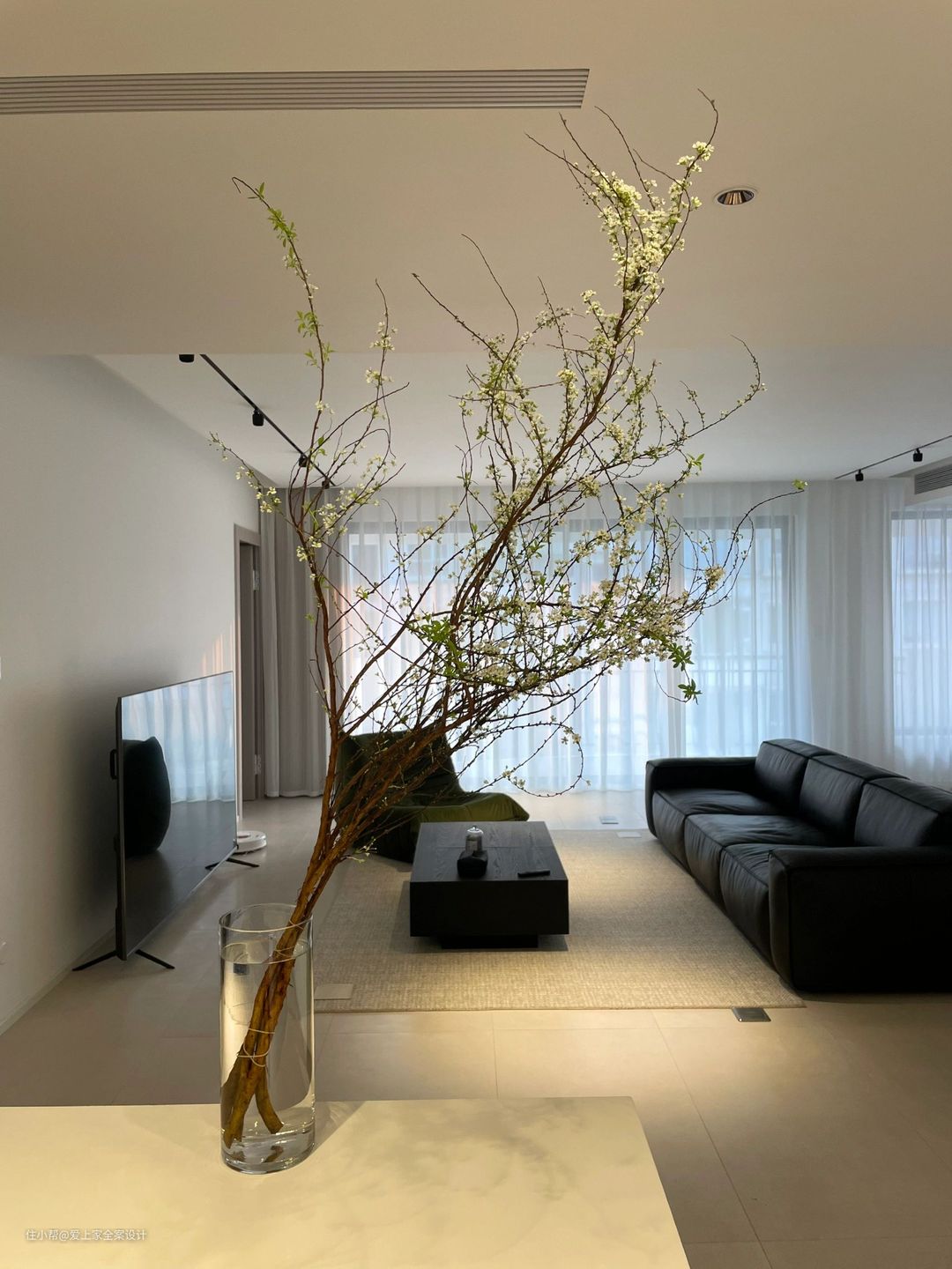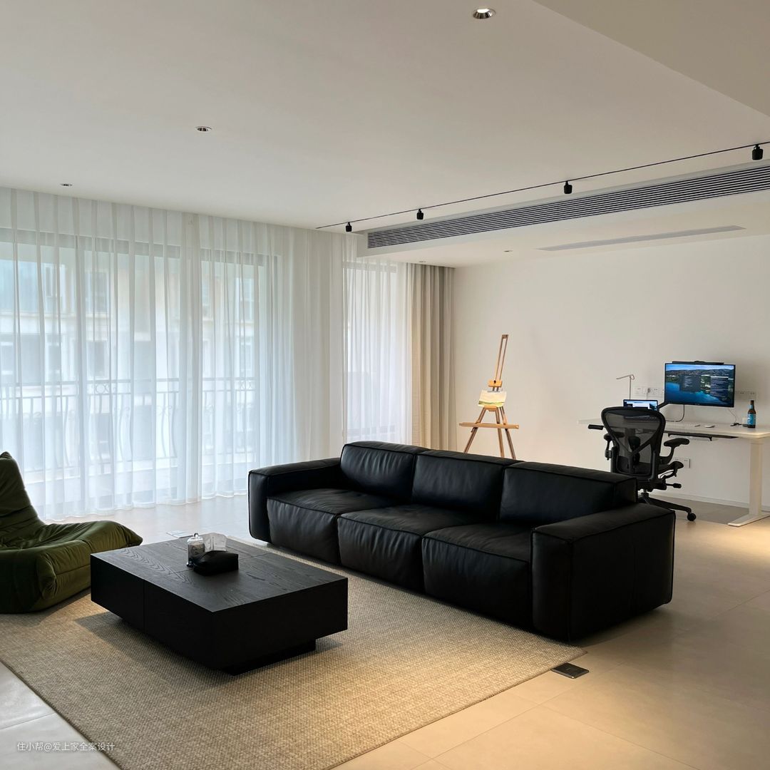 客厅采用暖色调为主,墙面通刷奶白色乳胶漆,搭配黑色皮质沙发和茶几,简洁而不失时尚感,营造出舒适的空间氛围。整个空间的设计非常大气,中央放置的的米色地毯,为空间增添了一份别致气息。