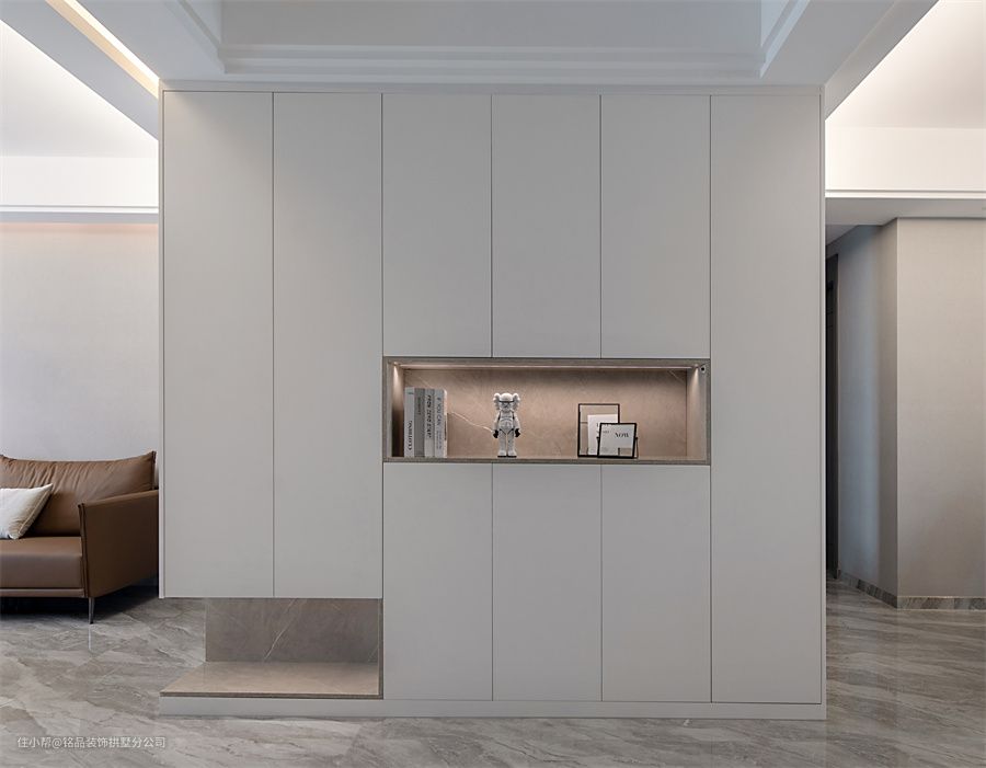 入户玄关柜用整面墙打造,采用通顶柜子搭配无把手设计,在拥有大量储物收纳功能时也保证了外观的简洁,中间部分镂空做展示柜,可以放些装饰品进行点缀,下侧则可以放些花花草草