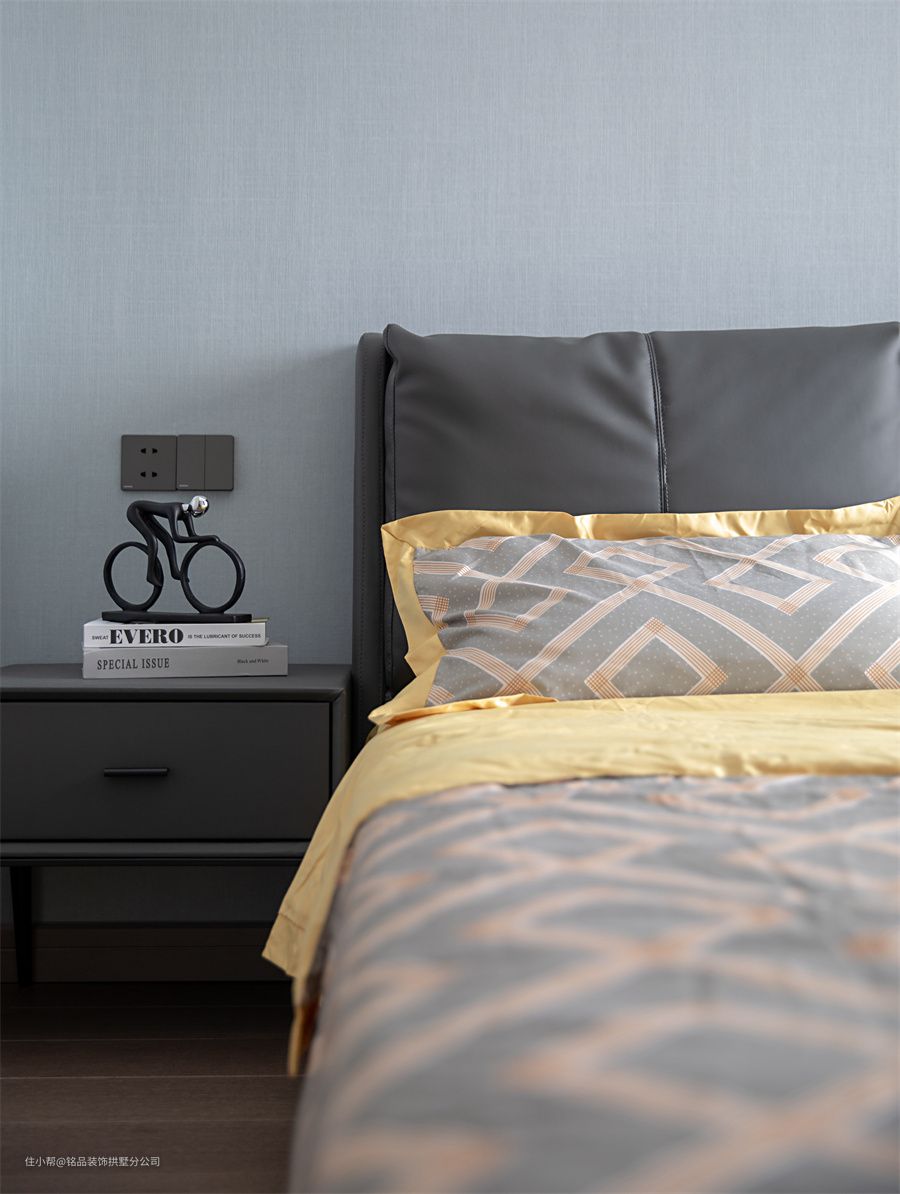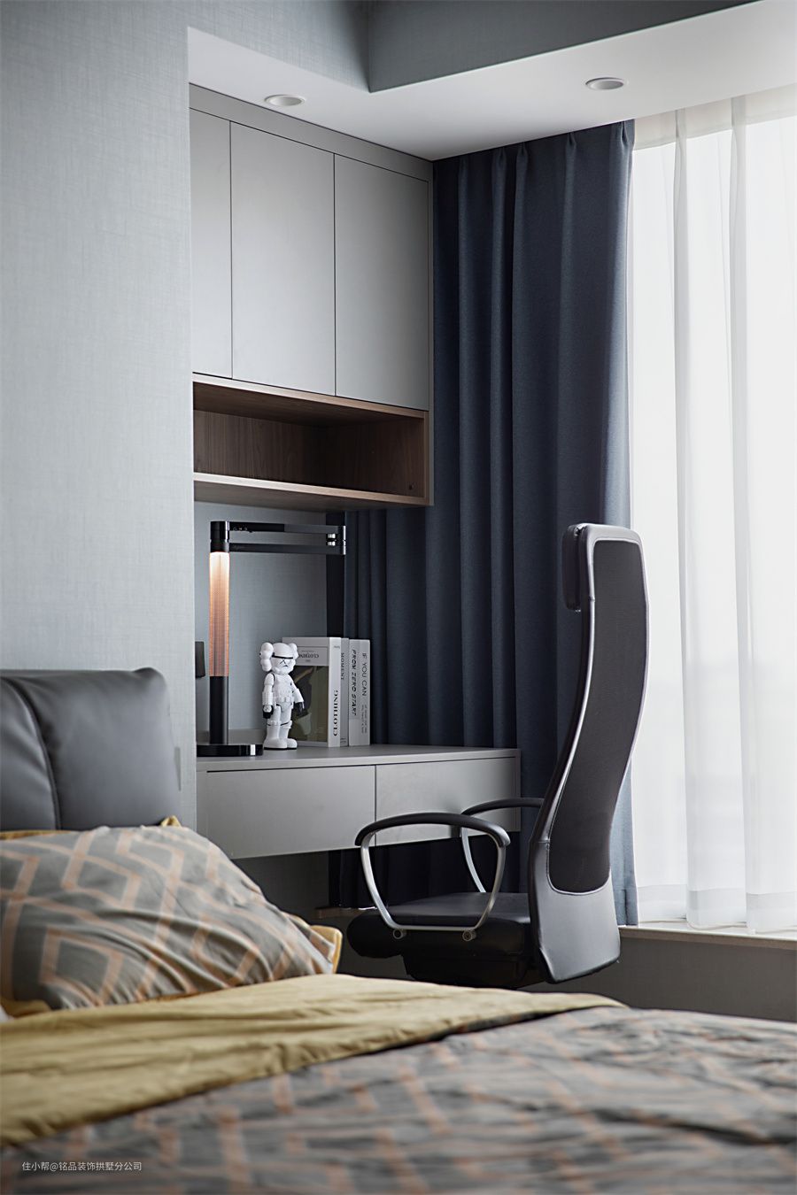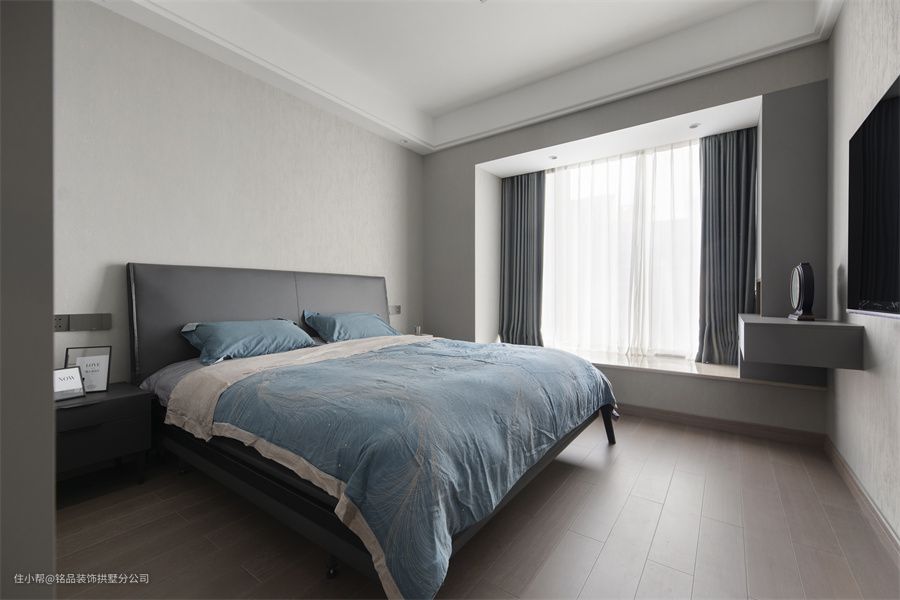 次卧面积也并不小偏冷色调些,硬装部分在阳台一侧设置储物柜,满足小物品的收纳,延伸出一个小平台方便放东西