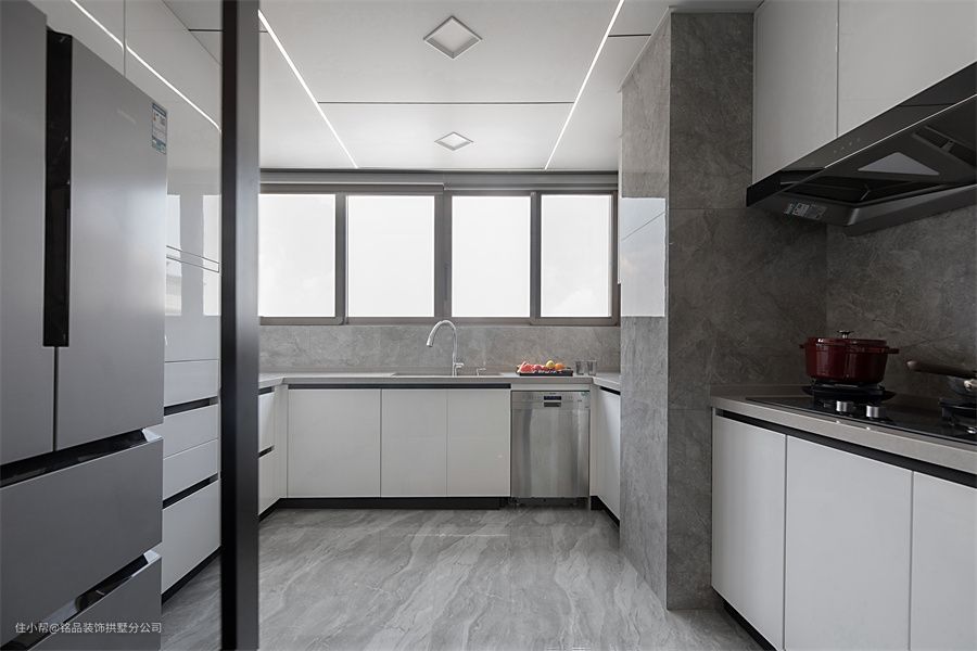 厨房在原有窗户的基础上进行改造,重新开了一整排的窗户,带来绝佳的采光,再搭配玻璃门让阳光也可以撒进餐厅。原本一侧有无法拆除的承重梁,索性就利用起来分隔出灶台区,减少突出物造成的影响