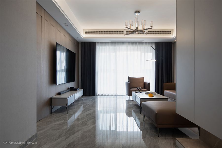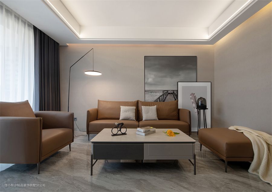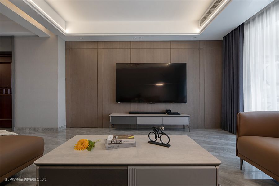 简约风客厅也可以用主灯,小巧吊灯并不会挤占空间,还可以配合顶部留白塑造艺术感,两侧内嵌灯带给吊顶带来光影层次感 电视墙用深色木纹板做全包,把背后的卧室门也可以较好的隐藏起来,在视觉上形成统一的整面背景墙,不会破坏整体营造的氛围 软装搭配从实用出发,电视柜和茶几选的是一套黑灰撞色设计,简单大方还不失设计感。挑选褐色皮革面沙发,丰富客厅风格,加一份轻奢感