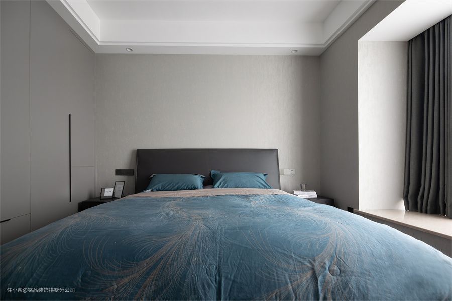主卧淡雅蓝色墙壁,整体氛围舒缓适合休息睡眠。L形拐角将阳台区域延伸进来,可以搭建一个办公区方便日常简单办公或梳妆需求,做隐藏窗帘盒让外观利落清爽些