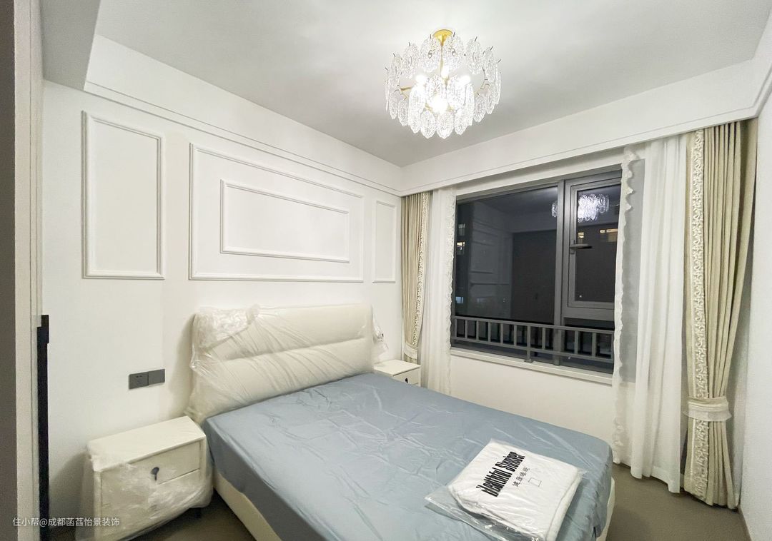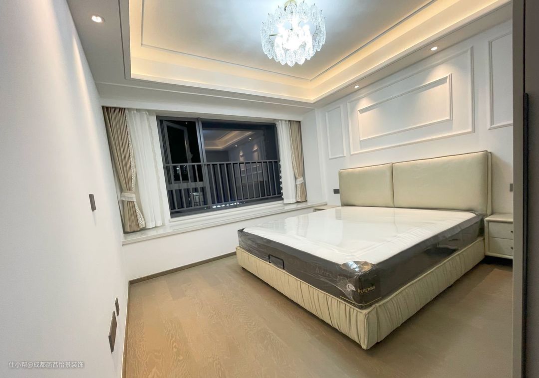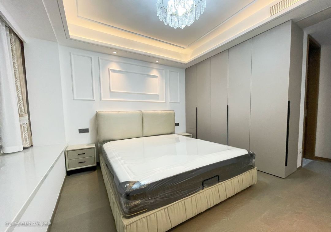 主卧的设计延续了客厅的风格,光线柔和又舒适。床头做了2个射灯,满足睡前阅读的光想需求。