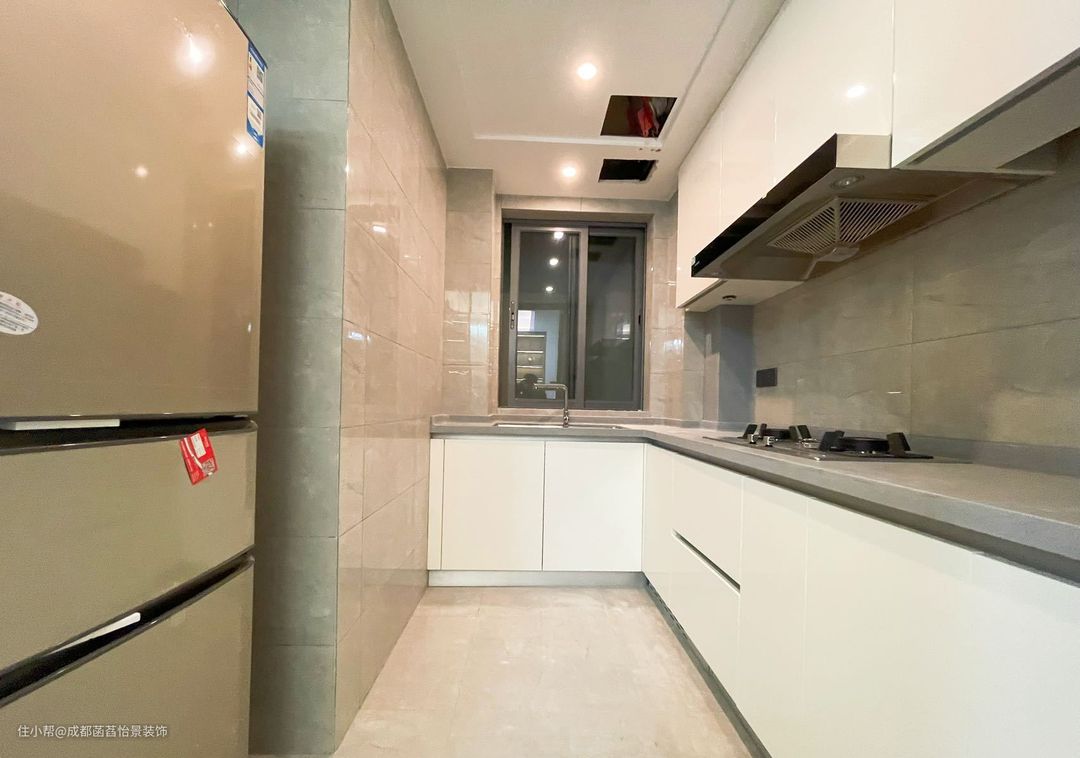 厨房做的L型操作台,动线流畅。吊柜和地柜都做,增加收纳。通顶到地设计,减少卫生死角。