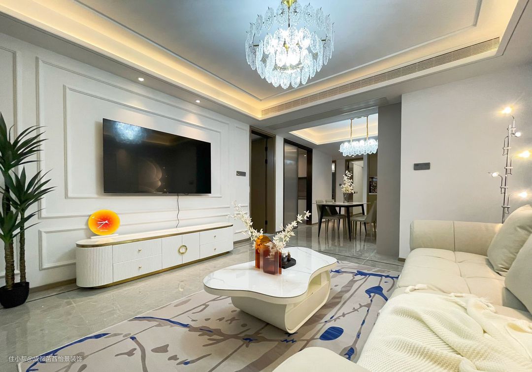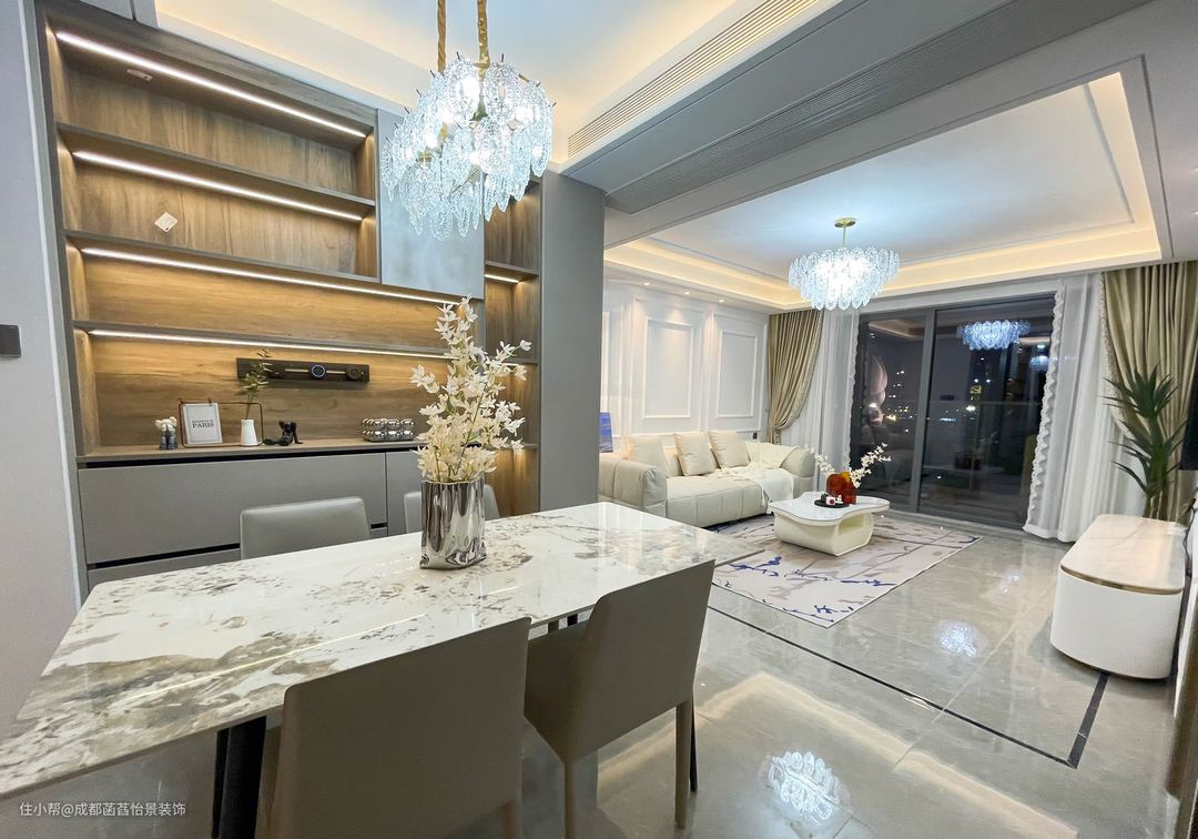 餐厅也是做的双眼皮吊顶,灯带搭配吊灯,光线柔和又充足舒适。餐桌背后做了定制餐边柜增加收纳。