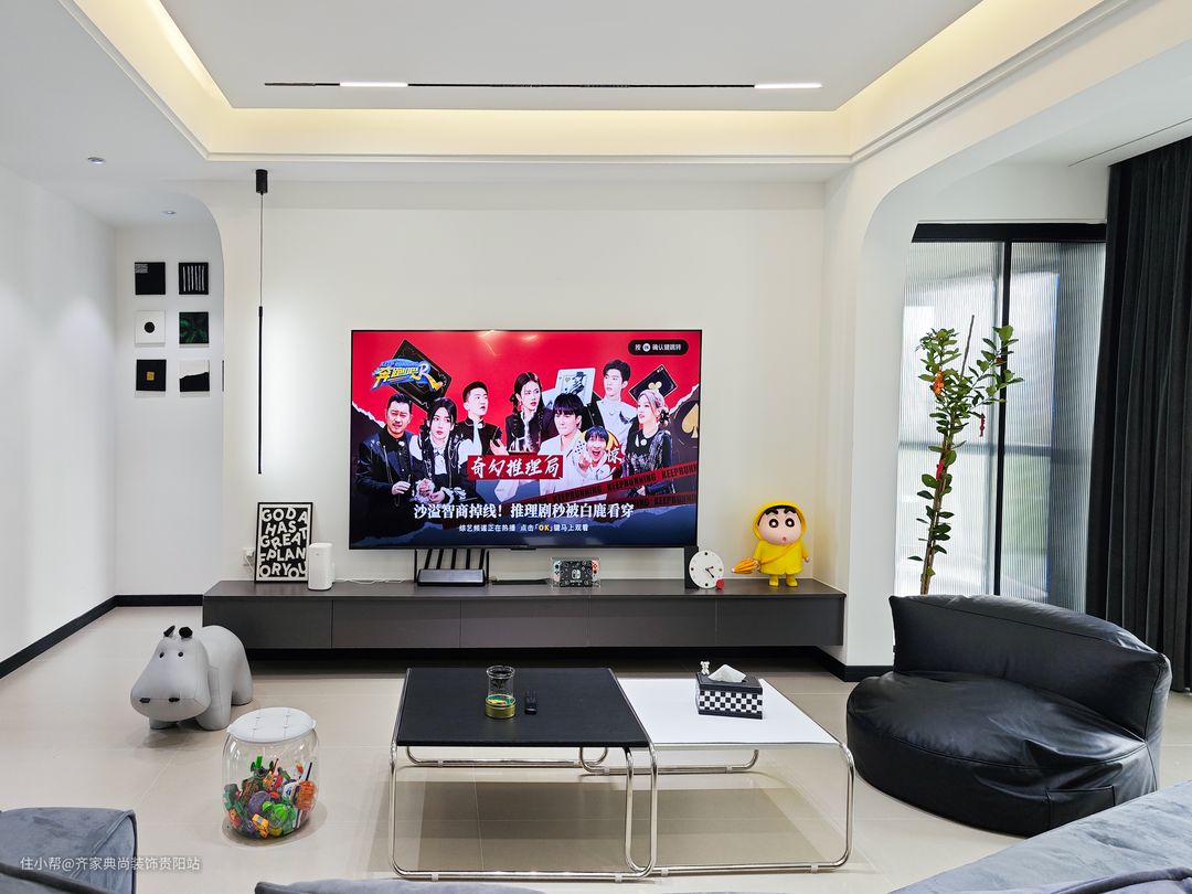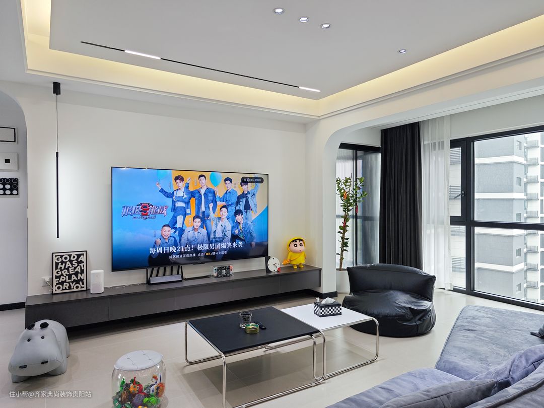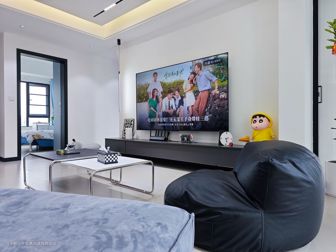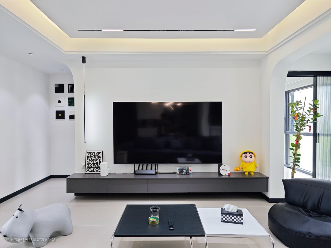客厅作为共享空间,体现出主人品味和家庭文化内涵,整个空间硬装设计没有花哨的装饰,主打黑白,创造一个简约的空间视觉感。 电视墙白色乳胶漆,电视柜的选材、款式与客厅整体风格协调,在视觉给人鲜明的冲击感,简洁的吊顶、无主灯设计,使客厅显得简洁大气、实用性强。
