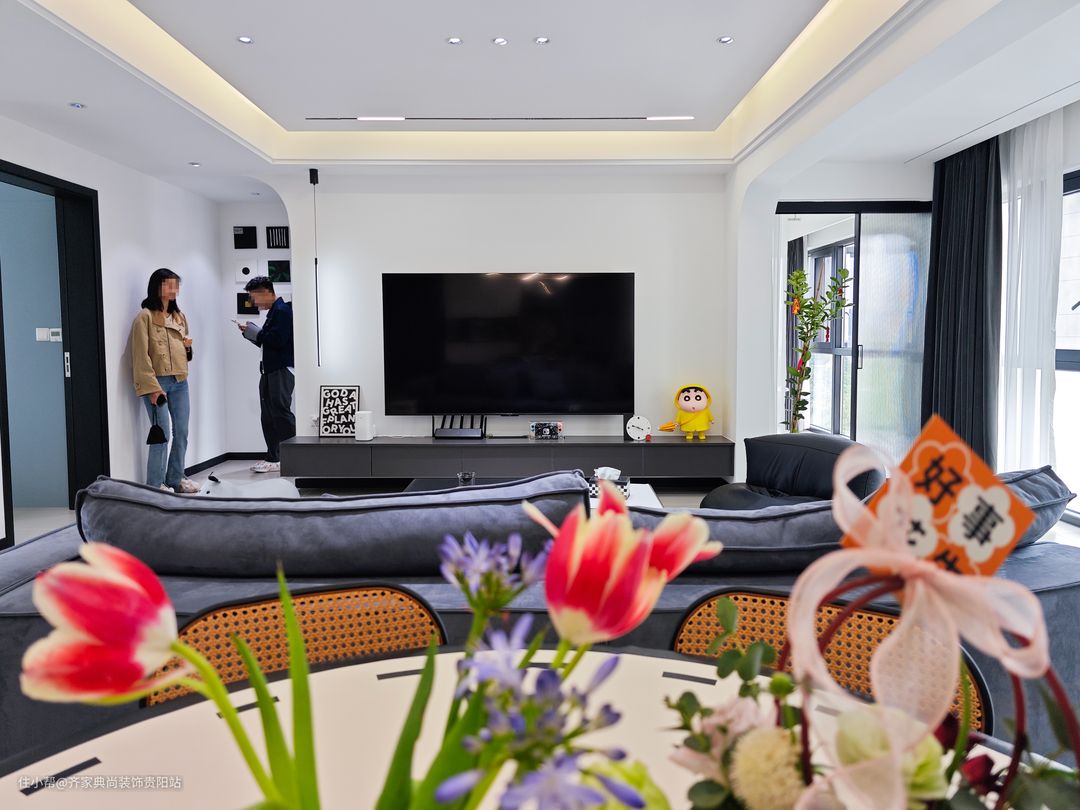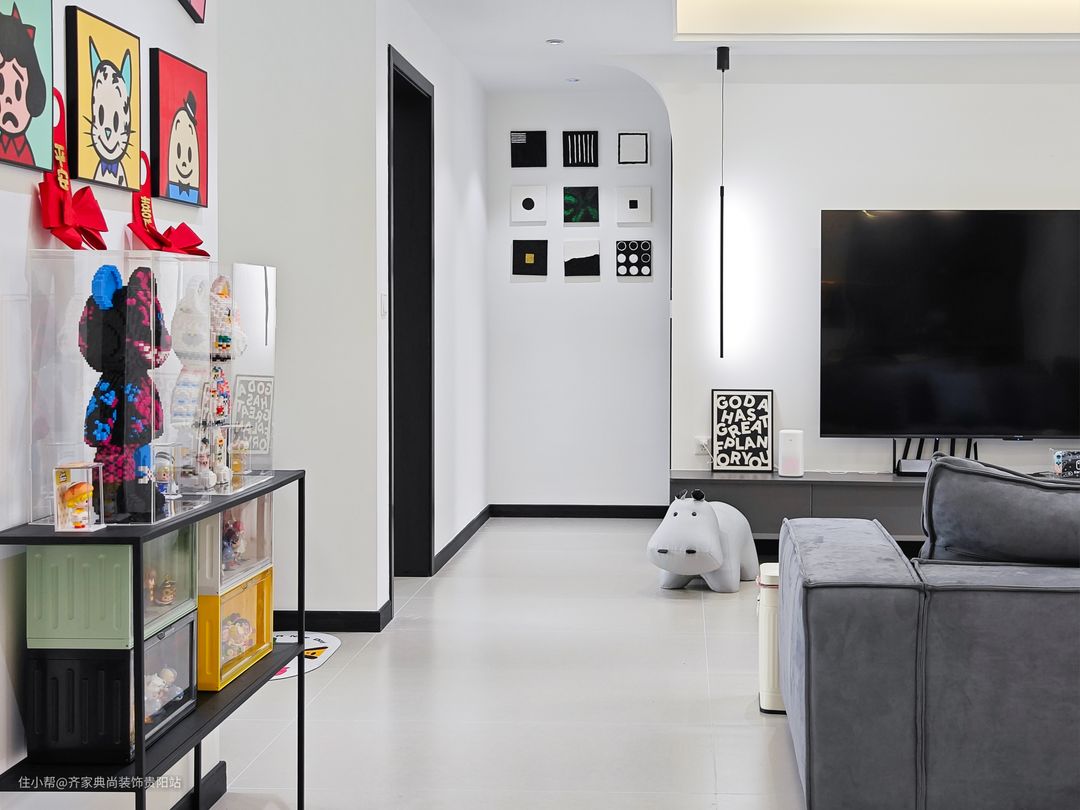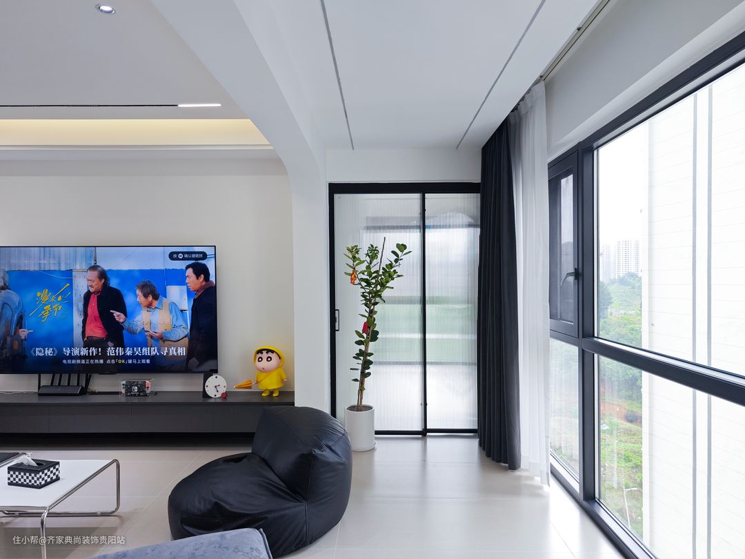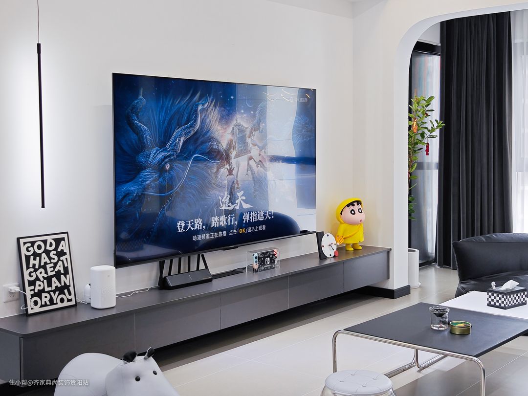 客厅作为共享空间,体现出主人品味和家庭文化内涵,整个空间硬装设计没有花哨的装饰,主打黑白,创造一个简约的空间视觉感。 电视墙白色乳胶漆,电视柜的选材、款式与客厅整体风格协调,在视觉给人鲜明的冲击感,简洁的吊顶、无主灯设计,使客厅显得简洁大气、实用性强。