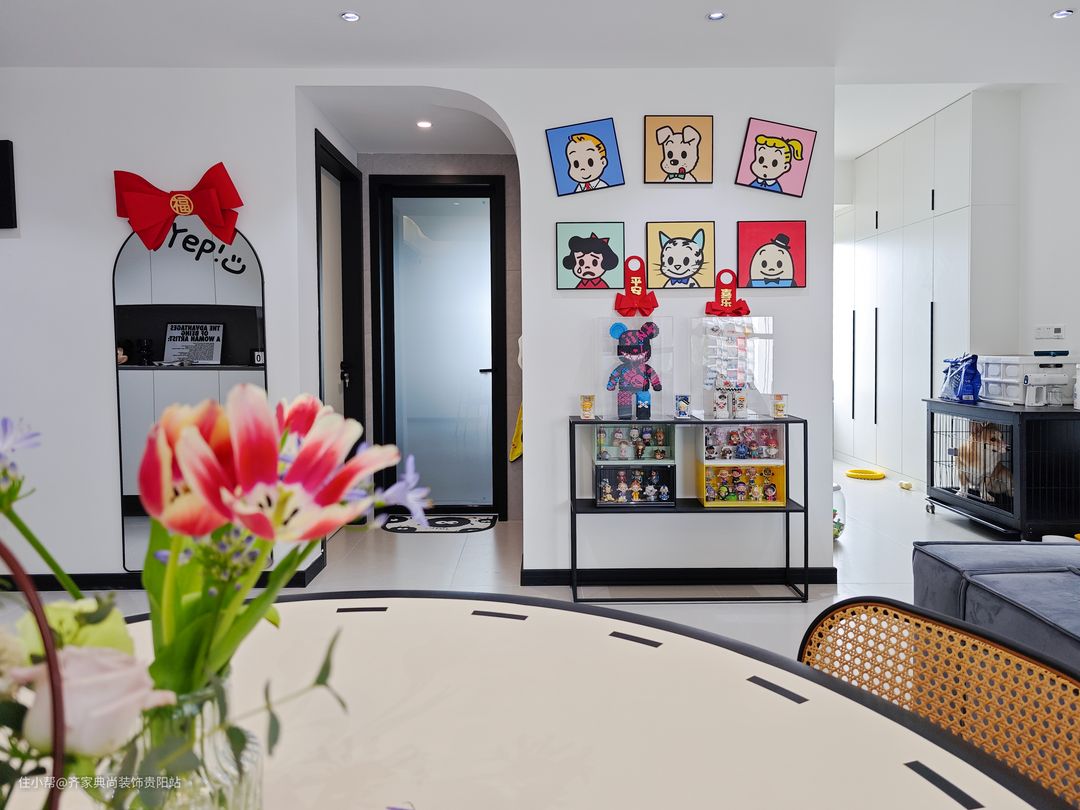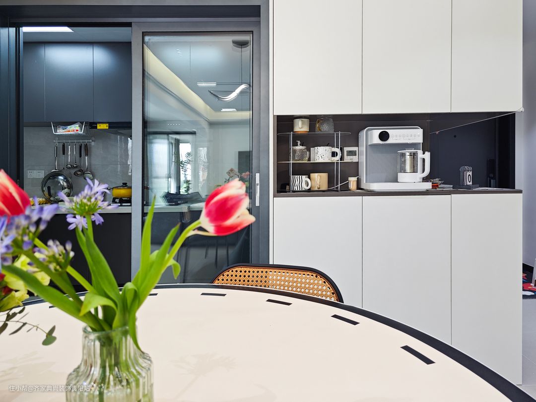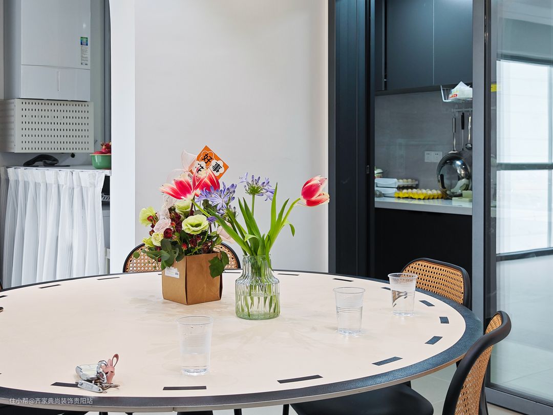 餐厅的整个色彩搭配上,因为是处于和客厅在同一个横厅内,所以色彩选择上以黑白色和米色搭配,餐厅背景同样以白底黑框为主。 餐桌改换成圆桌点缀,视觉上明亮有层次,放置装饰物品可以体现出家庭文化和生活趣味。鲜花这些物品的质感、颜色、造型和款式都能反映出主人的情趣和品位