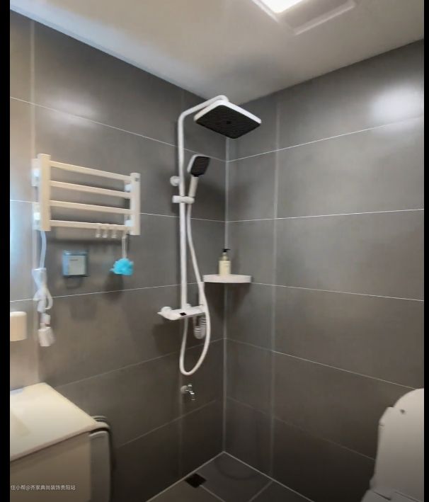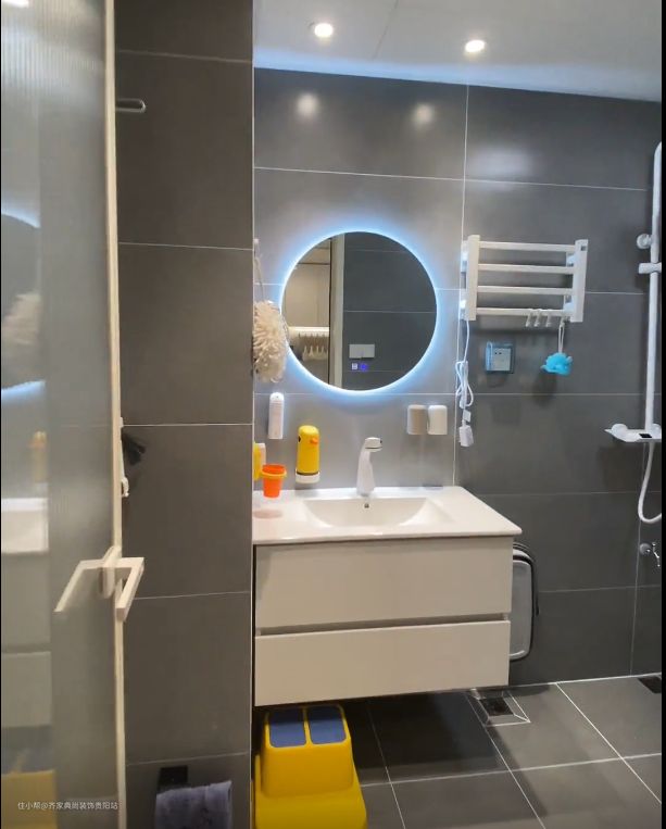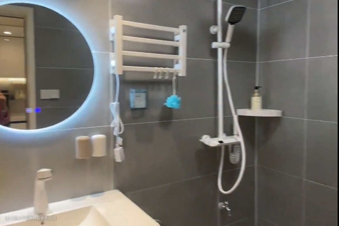 卫生间的设计采用明亮、干净的色彩灰色,提高实用性和易于清洁。 选择边角弧形的洗脸盆,圆形的马桶,能够弥补角落过于棱角分明带来的不适,日常使用也方便, 墙边做挂墙收纳增加浴室的洗浴用品储纳,减少了置物架的使用影响空间使用面积,可调控的智能洗漱镜,早起化妆更方便。