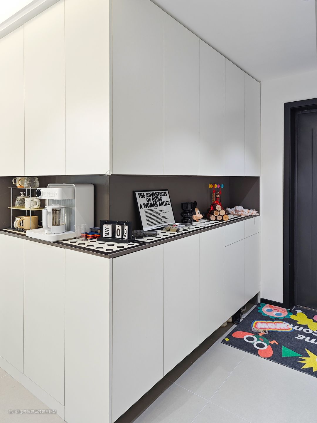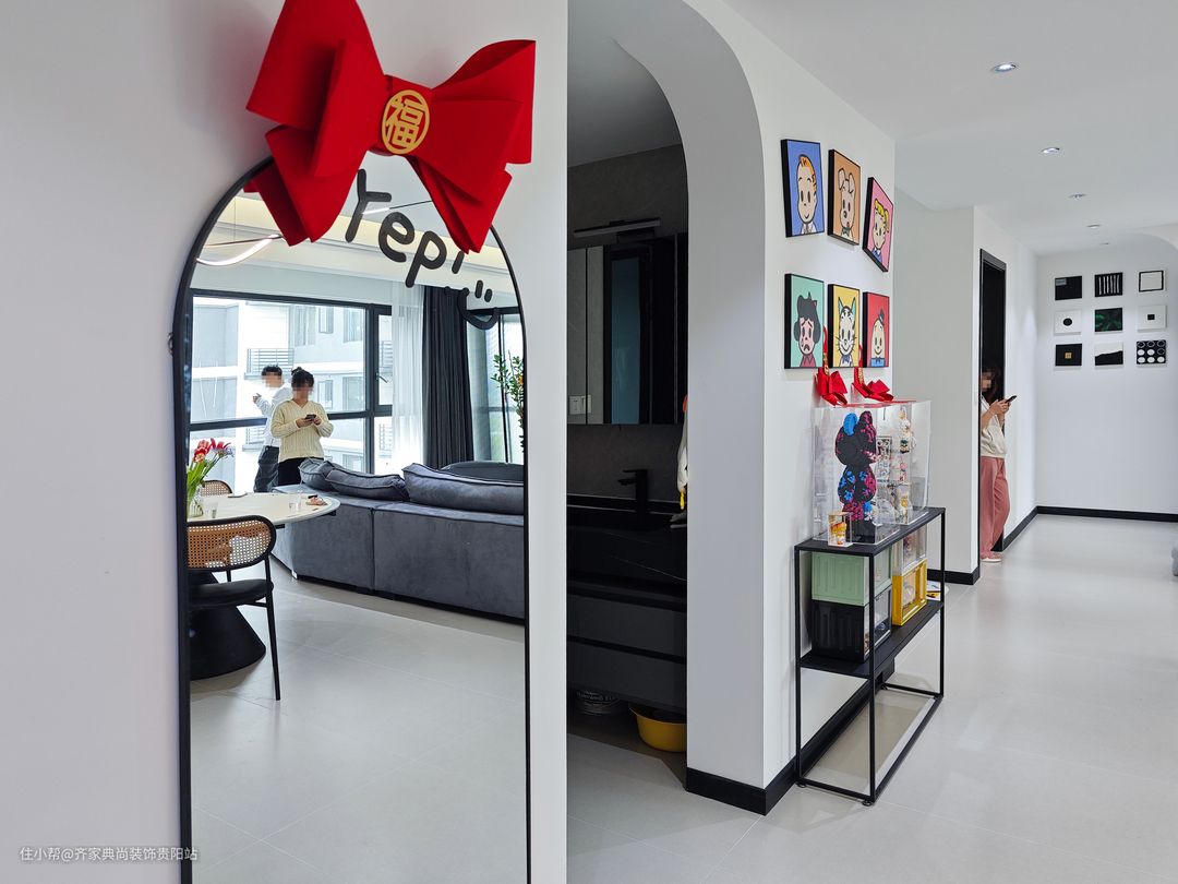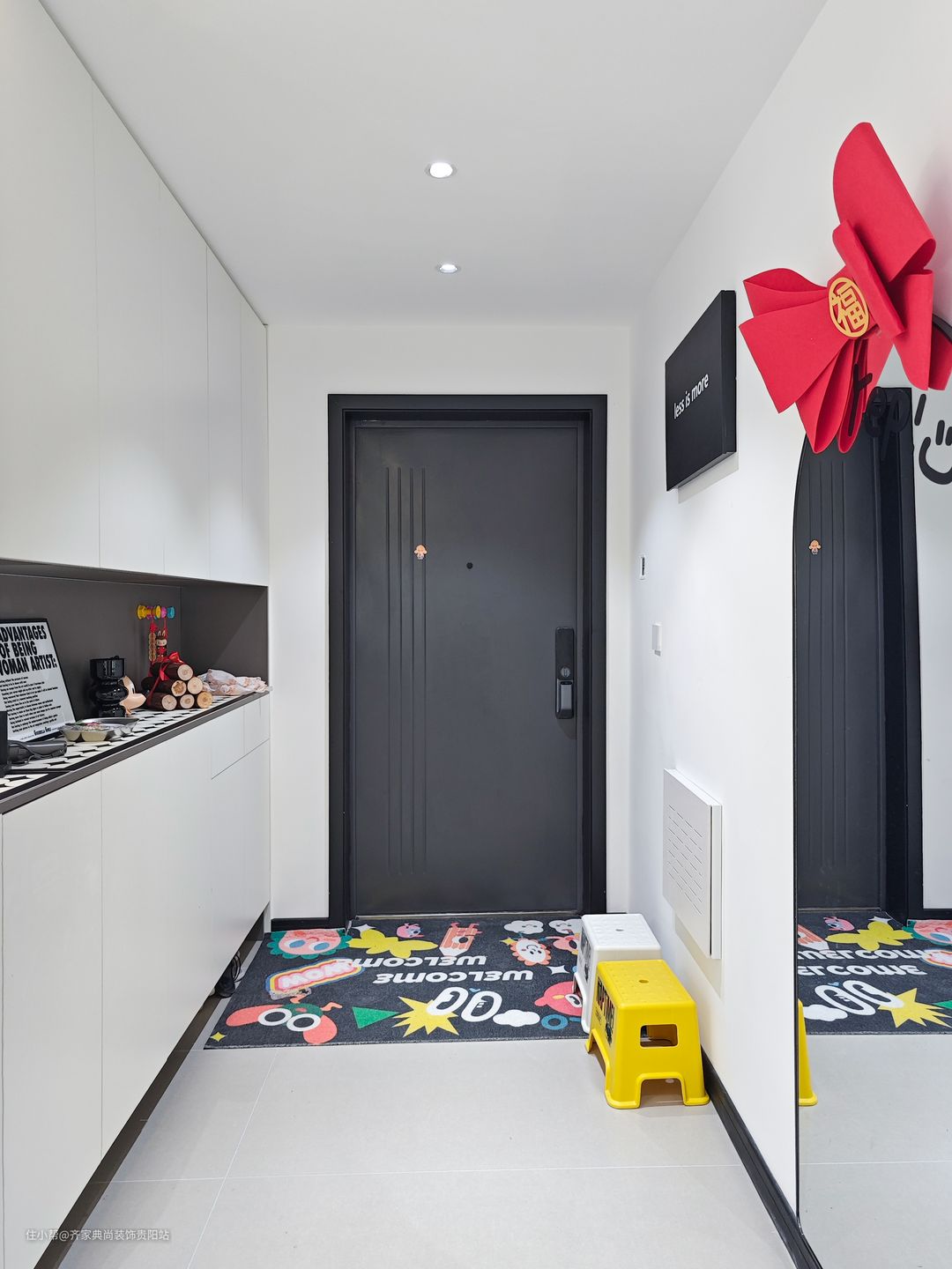 入户的左手处,是一整面大的玄关柜,延伸到顶;纯白柜门,隐形把手,呈现出空间轻松温润的氛围,步入空间,再多疲惫在此刻都能被治愈。 底部悬空的设计让整个柜体更显轻盈,不仅换鞋方便,还不留清洁死角 局部镂空撞色打破“沉闷”,精致的细节设计提升生活幸福感 入户的左手处,单独“造”个超大镜子解决了视觉的孤立,还形成了空间围合感
