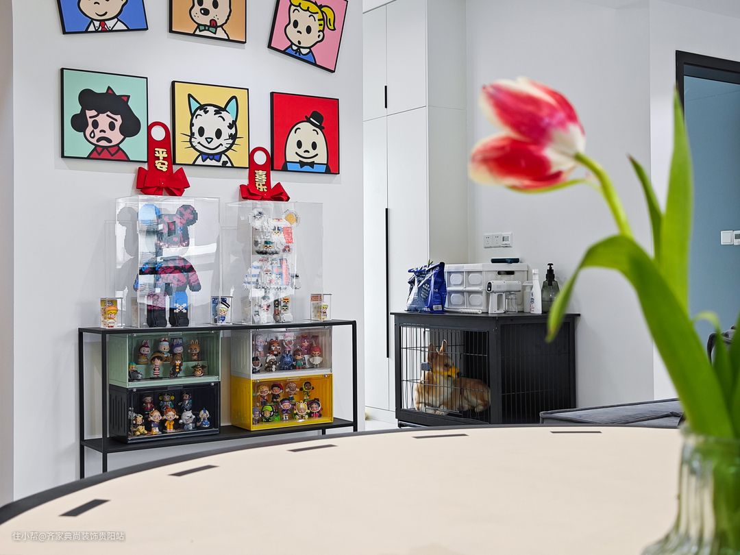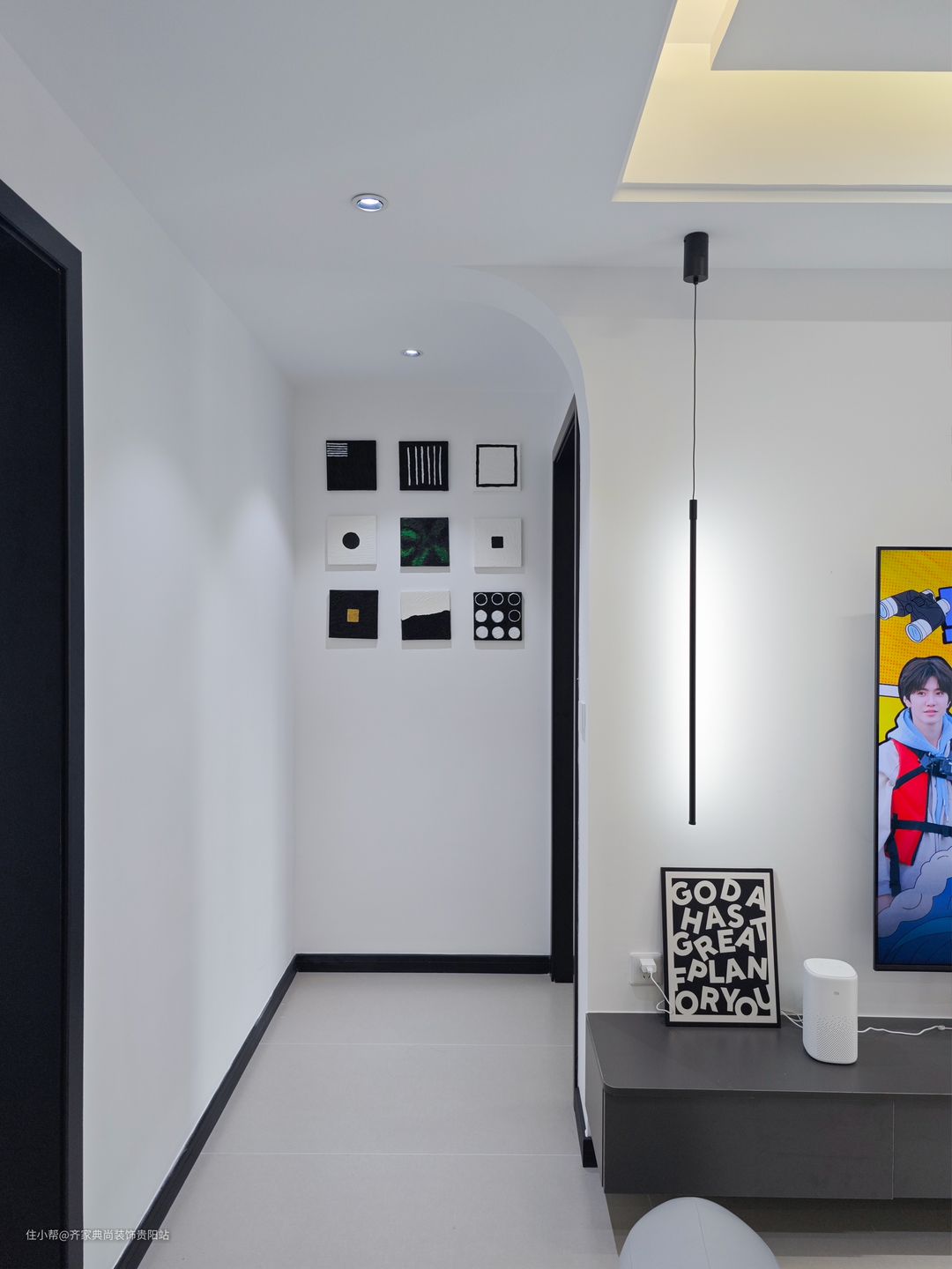 靠近过道,设计了一个展示区,与客厅一体,既不打破空间的整体性,又增加了客厅的使用功能。 放置展示柜或墙面安装,不仅削弱墙面空间空旷,同时还可以展示收纳物品,把一些装饰品悬挂在墙上,以起到美化过道的作用