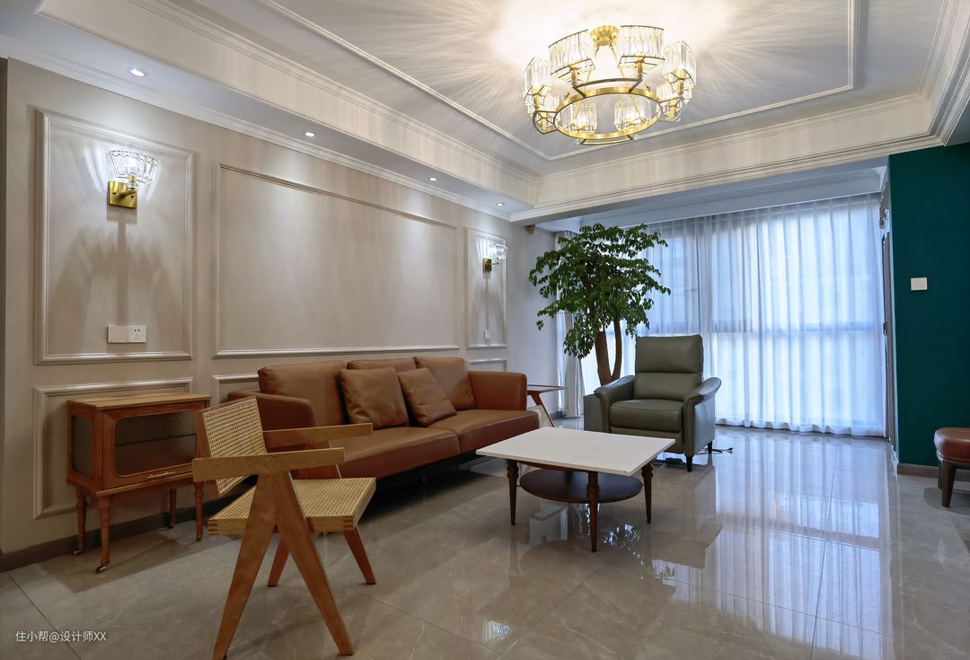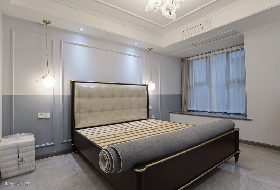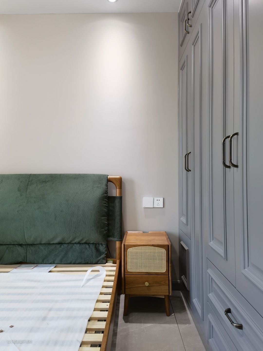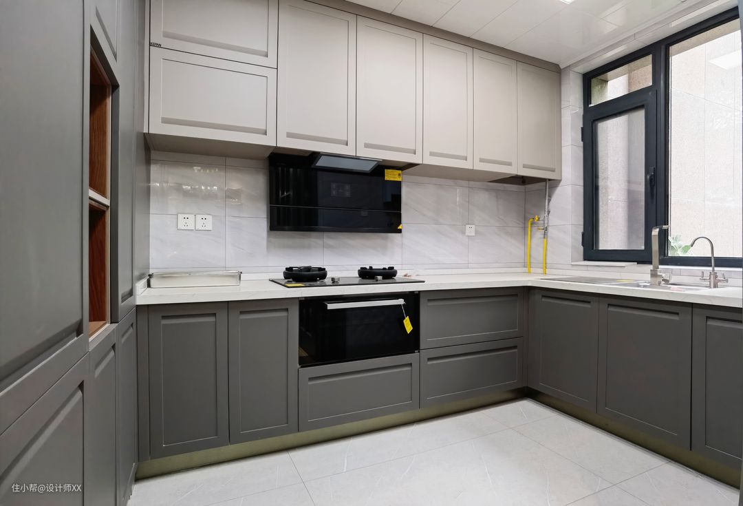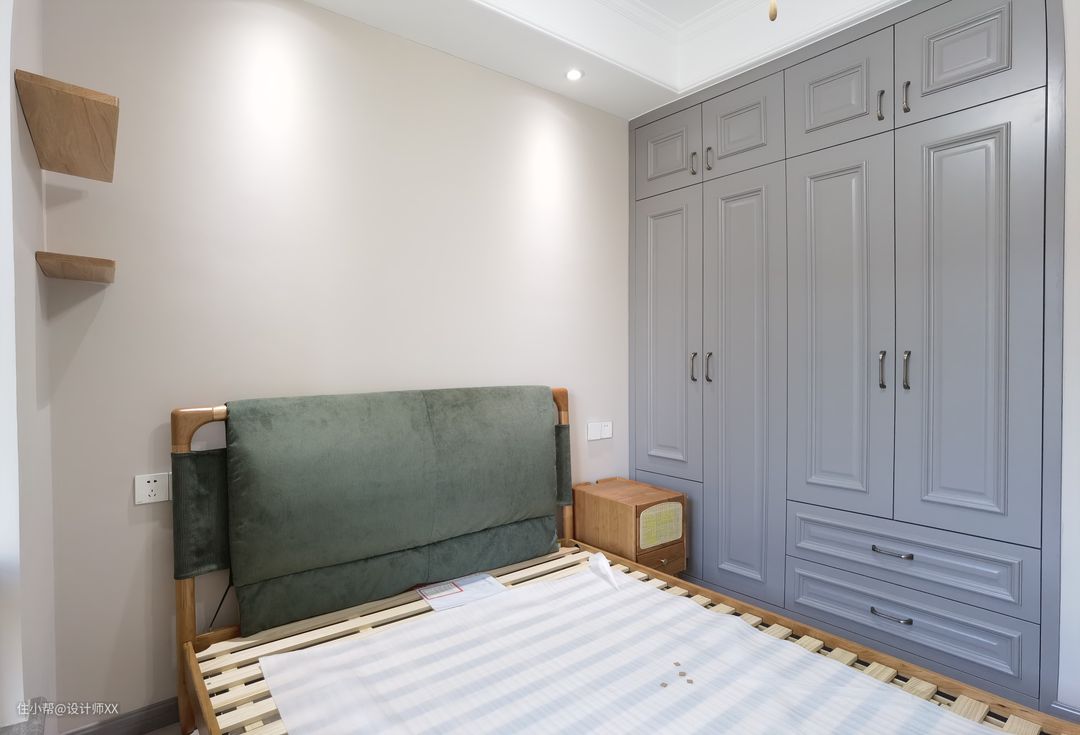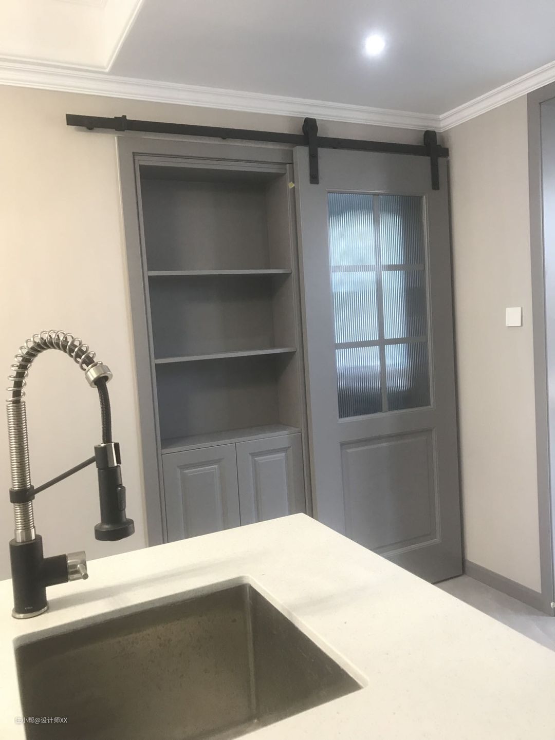 厨房门做的外挂推拉门,既体现了美式风格的元素,也不占空间,让厨房的空间实用性更强,同时也巧妙的与旁边的收纳柜很好的结合到一起,不显得突兀。橱柜设计整体做了U型橱柜,左侧高柜使用嵌入式冰箱,让整个厨房空间的收纳最大化,同时也避免了很多卫生死角,从而达到干净整洁的目的。
