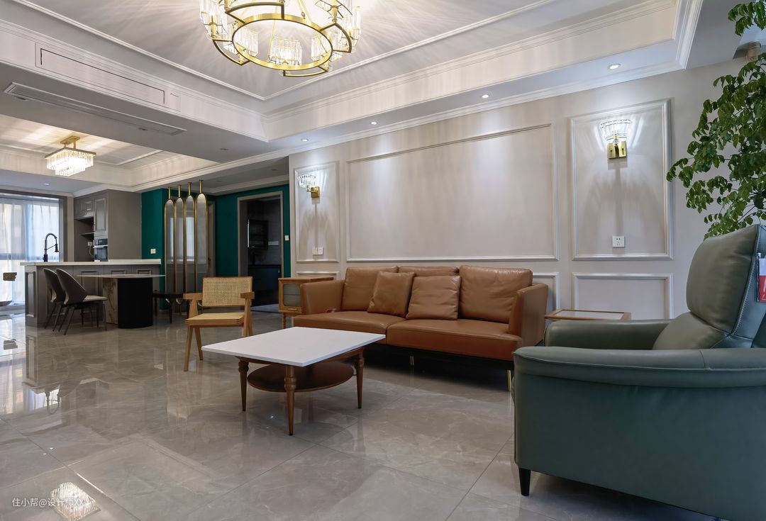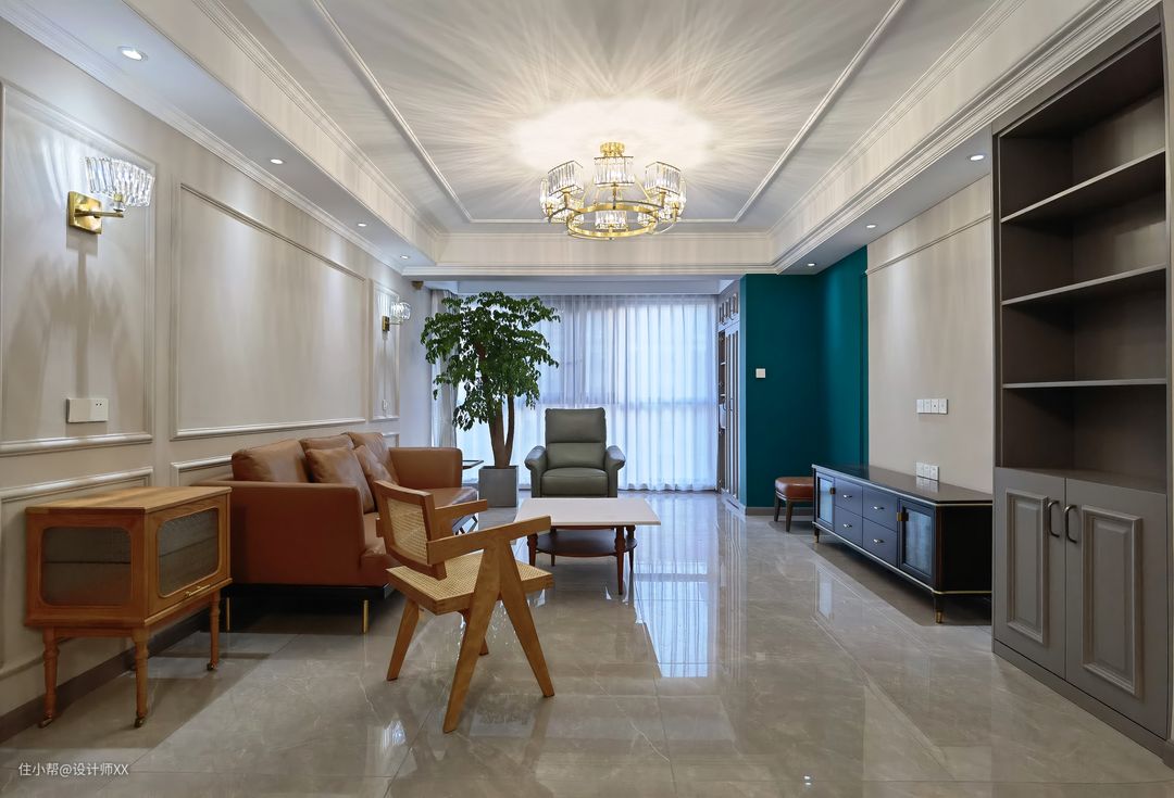 客厅空间主要弱化了与客厅挨着的阳台区域,一是为了增加整个客厅区域的空间感,二是增加客厅区域的采光,同时配合阳台整面的落地窗,让整个客厅的视野也更开阔。色彩搭配上,通个冷暖色调的碰撞让整个空间的视觉效果更加饱满,局部使用了高饱和度的孔雀蓝,不仅显得高级有质感,也让空间更具视觉冲击力,让人耳目一新!