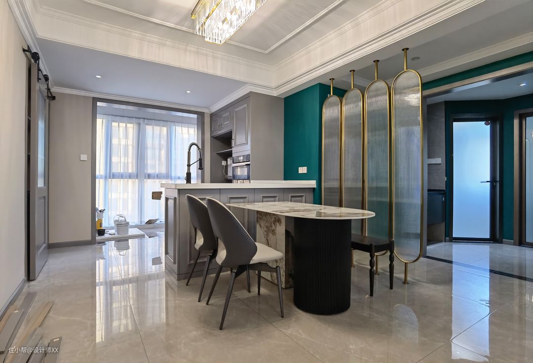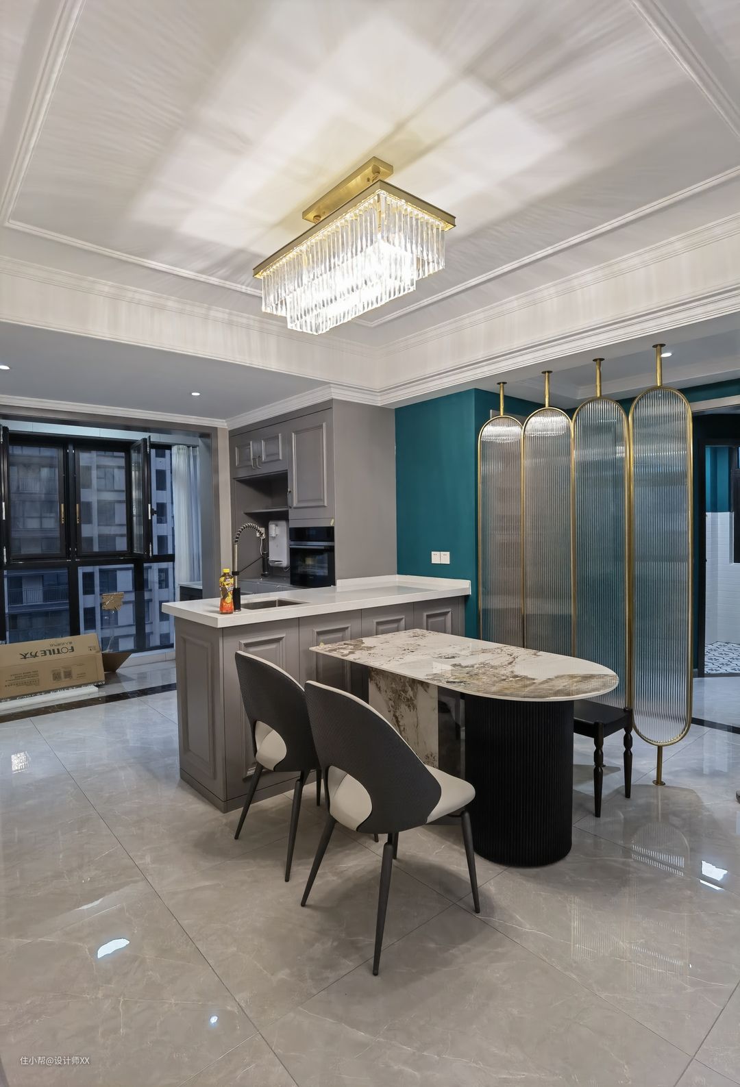 餐厅空间通过吊顶重新做了区域划分,合理利用浪费空间的同时增加了西厨这个功能空间,这样不仅对厨房收纳做了足够补充,也提升了餐厅的实用性和高级感,满足业主对烹饪的更多可能和乐趣,同时西厨也满足了水吧的功能。