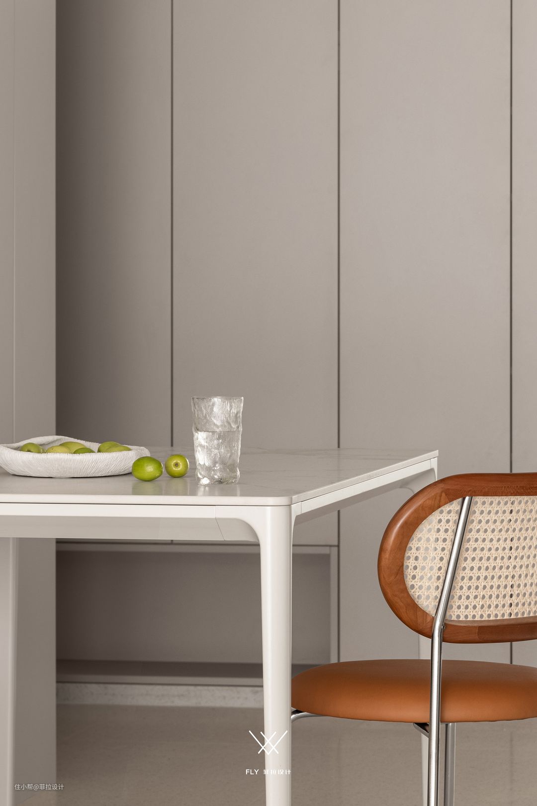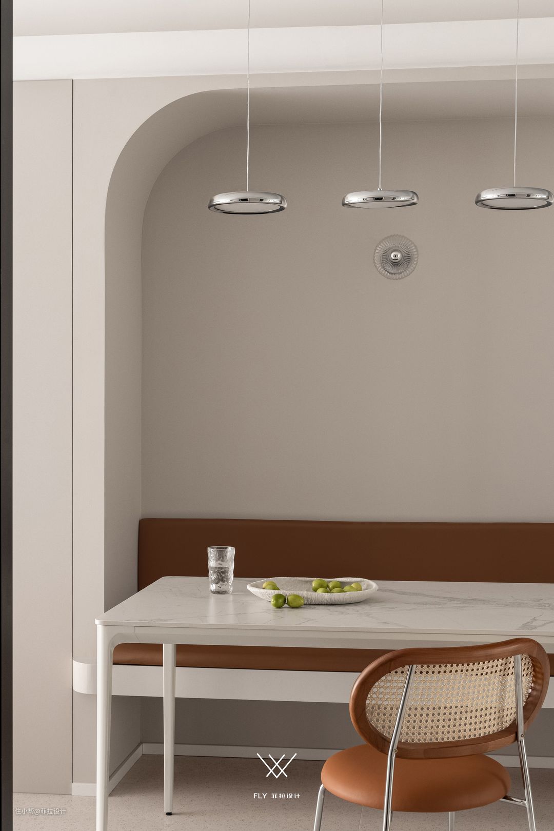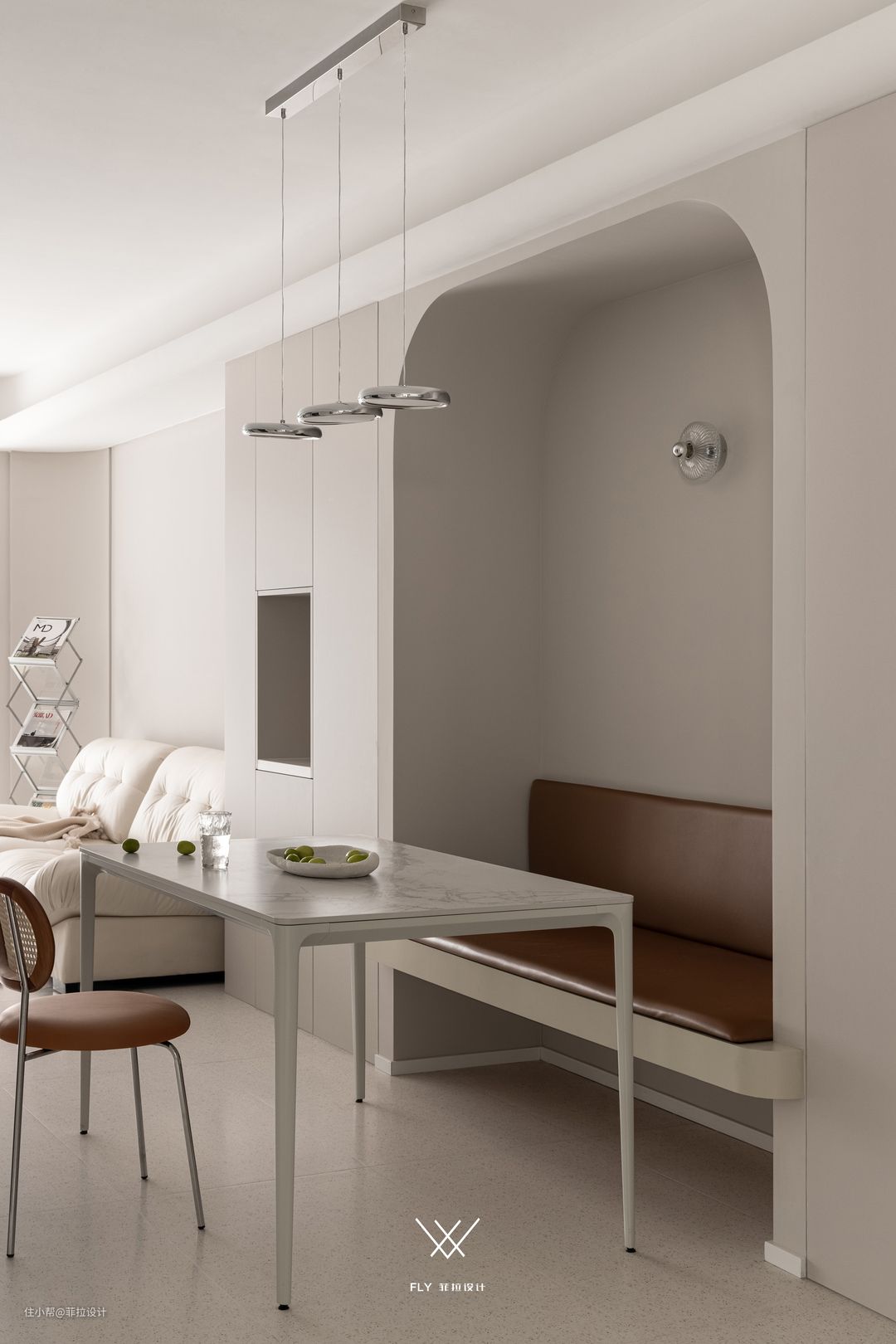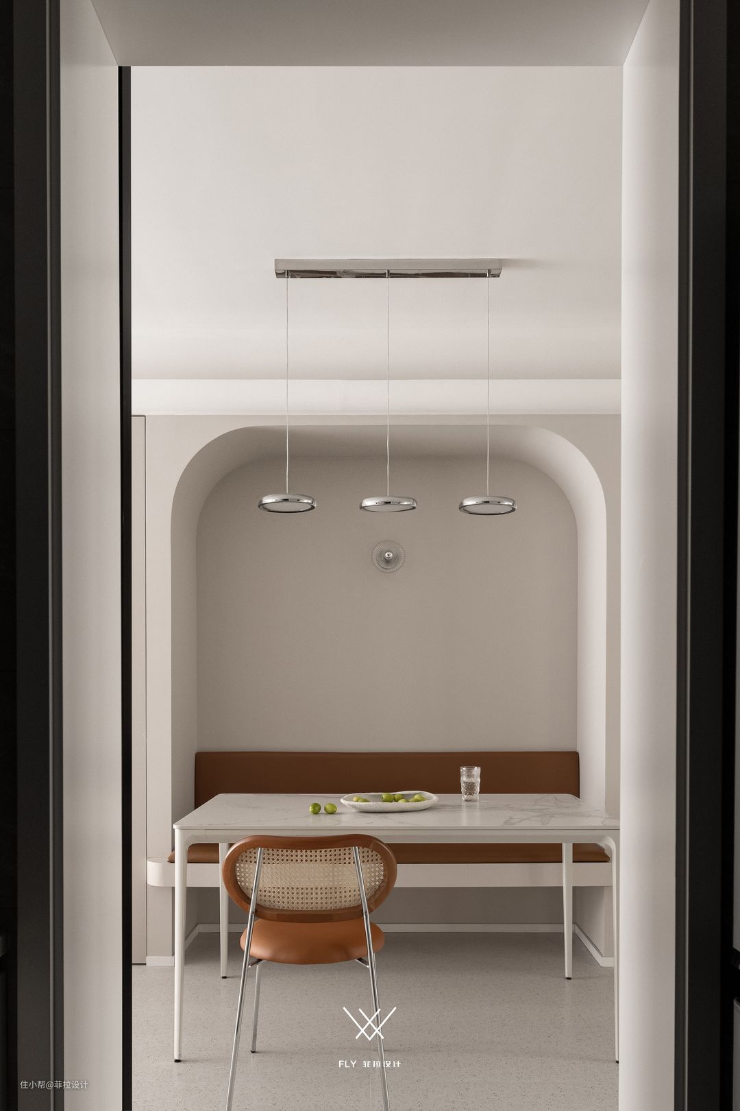 一进门右侧便是餐厅,接着是客厅,所以餐厅的空间并不是特别独立,而且处在整个主动线的位置。我们在餐厅的设计上就是希望它可以有自己的区域感,同时又不影响整个主动线的便利。 结合了空间位置、区域感受、收纳需求这三个特点,便有了现在的餐厅形式。整个餐厅我们靠近一侧墙体来做,这样就不会占用主动线的空间,整个家里面行动路线是流畅、不受阻的。贴着餐厅这一侧墙做了一大面柜体充当餐边柜强化收纳功能,当然也可以作为其他收纳需求的补充。然后中间留有放两人位的卡座。 厨房看向餐厅角度;卡座上方的位置与柜体连接做了一个曲面的造型,这样看起来就像是卡座与餐边柜是镶嵌一起的和谐,而不是卡座将餐边柜一切两半。