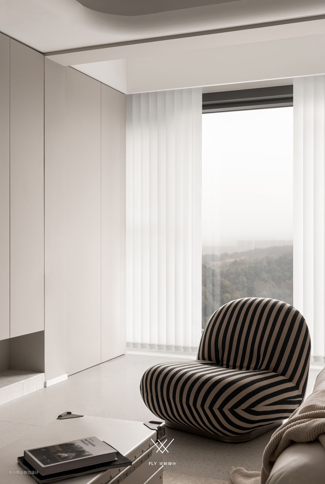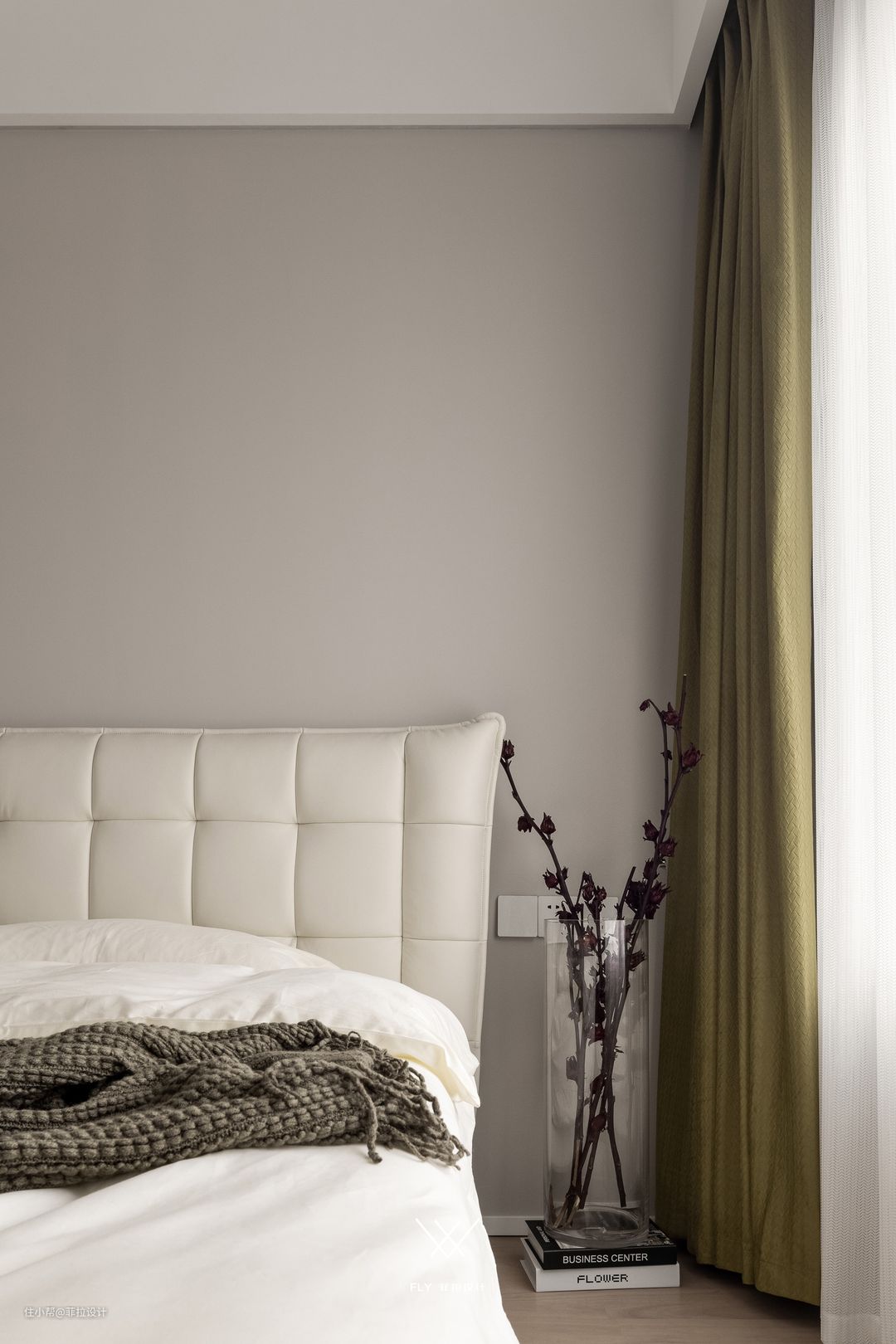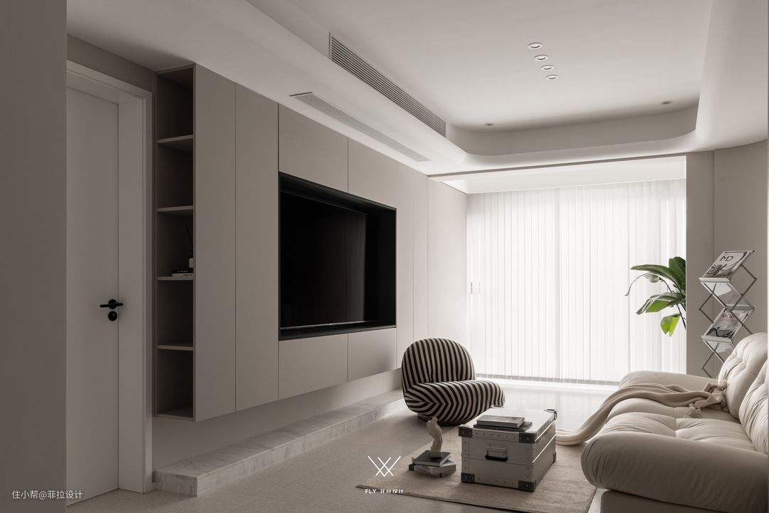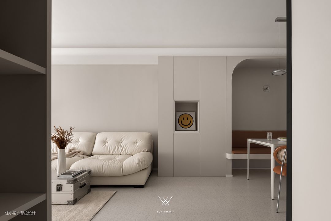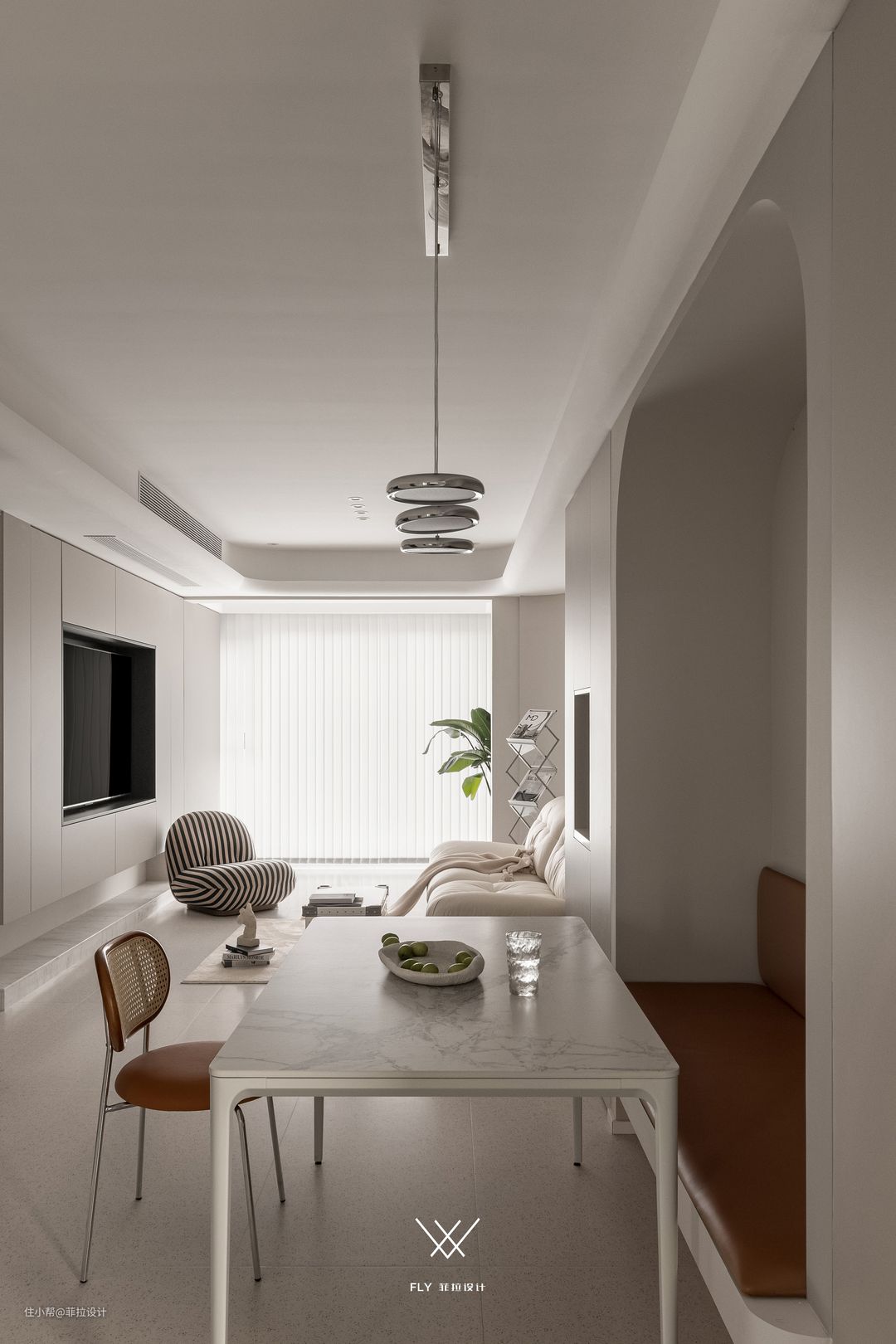 因为是刚需房,对于面积来说肯定是希望尽可能地都给充分利用起来,所以我们把朝南的所有阳台都包了进来,邻着客厅的阳台自然被纳入客厅,让原本看着略显局促的公共空间瞬间通透、敞亮了起来,深化了南北通透的效果。 阳台包入客厅之后,还是有承重墙存在,卡在客厅与阳台之间,为了加强视觉美感,希望改造后的阳台与客厅之间是融洽一体的,我们在右侧沙发背景墙邻着的阳台承重墙位置,做了一个曲面的衔接造型,既有着线条本身的柔软美感,又让阳台和客厅之间的融合更自然。在顶面对于风口,还有整个顶面的造型我们也做了处理,打造每一个面的细节,都为呈现最好的空间氛围。 刚需的家,再加上有了小宝宝,对收纳的高需求是无需多言的。我们在电视背景墙这块做的是一整面收纳柜体,中间留白一部分做电视的内嵌处理,柜体的下面不接地,悬浮状的处理既满足了高收纳的需求,又尽量不让客厅的面积看着被压缩,让家里面尽量呈现空间的轻盈感。 从主卧门看向客厅,可以看到最左边电视墙柜体没有全封闭,做了一个侧边格口柜,这个小细节可别小看它,既有弱化大面积柜体膨胀的效果,客厅也有了他们喜欢的物件摆放展示的空间。 窗帘选择的款很是简单大方,是公共空间一个很好的背景——干净、纯粹,有节律感,和室外景色的搭配呈现也很有意境。 从主卧门看向客餐厅角度,在餐厅一侧靠墙位置做了一组餐边柜,与客厅相接,增强空间收纳。